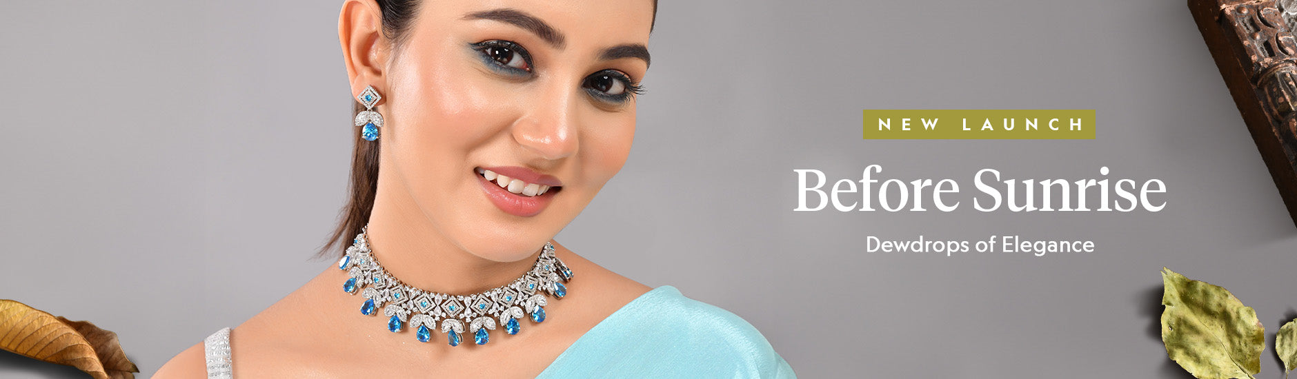 Inspired by the morning dew and the beauty of dawn, this lovely jewellery set has been fashioned out of brass. Teardrop and diamond cut turquoise blue and white zirconia gems adorn the silver plated necklace and earrings. Pair with a...