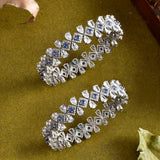 An opulent Bangles embellished with diamond and teardrop cut zirconia gemstones, inspired by the sparkle and beauty of the morning dew. Made from brass and silver plated, the bracelet is lightweight, comfortable and versatile.Weight (Gms): 62.44Size (LxW)(Inch): 7.1*6.5Material: BrassPlating: White...