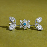The beauty of the morning dew and its purity have inspired this beautiful dual-finger ring, which has been made from brass. Embellished with white and sky blue cluster setting CZ gemstones, the silver plated ring is adjustable for maximum comfort.Weight...