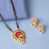 This mangalsutra set is designed keeping in mind a beautiful lady who loves flowers. The beauty of this set comes from the lotus motif with pearl drops in the center. Wear this brass set with any of your ethnic attire....