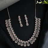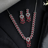 The silver-plated necklace set with matching Jhumki from CZ collection is a beautiful set of jewellery that adds a touch of sophistication and grace to any outfit. Made of high-quality brass with a silver finish, the necklace features intricately designed pendants adorned with sparkling CZ stones, complemented by matching Jhumki that complete the look. This set is perfect for special occasions, adding a touch of elegance and glamour to any look.