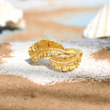 Inspired by the tropical elements that make beaches an absolute favourite of many, this overlap design ring features dainty palm leaf motifs. Made from brass and yellow gold plated, the ring is adjustable for maximum comfort and will pair well with all your favourite outfits.