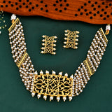 Filigree patterns inspired by classic Arabesque designs adorn this beautiful and dainty necklace set, which has been fashioned out of brass. Embellished with shell pearls and crafted for style and comfort, the necklace and matching drop earrings have been given...