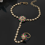 Elevate your festive and wedding ensemble with this stunning Hath Phool from Voylla. Crafted from high-quality brass and plated with elegant gold, this piece exudes sophistication and charm. The intricate design features a delicate chain adorned with sparkling American diamonds, leading to a captivating floral centerpiece with vibrant pink petals. The matching ring, connected by a dainty chain, completes the look, making it perfect for any special occasion. Whether it's Diwali, Rakshabandhan, Holi, or a cocktail party, this Hath Phool is an ideal gift for your sister, girlfriend, wife, mother, or any special woman in your life. Celebrate love and elegance with this exquisite piece, perfect for Valentine's Day, Christmas, New Year, or any festive celebration.