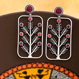 Tribal motif adorned drop earrings, made from brass and designed as a tribute to India's legendary Warli artform. Silver plating adds to the charm of this pair, which has been lightly embellished. Pair with any of your favourite outfits.