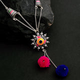 Colorful enamel pom pom statement necklace inspired by a glimpse of Kalbelia attire. Made of brass and oxidized silver-plated, this necklace can go well with traditional attire.Weight (Gms): 15.78Size (LxW)(Inch): 22*1.2Material: BrassPlating: Oxidized SilverColor: SilverSales Package: 1 NecklaceProduct Code: 8905124131468