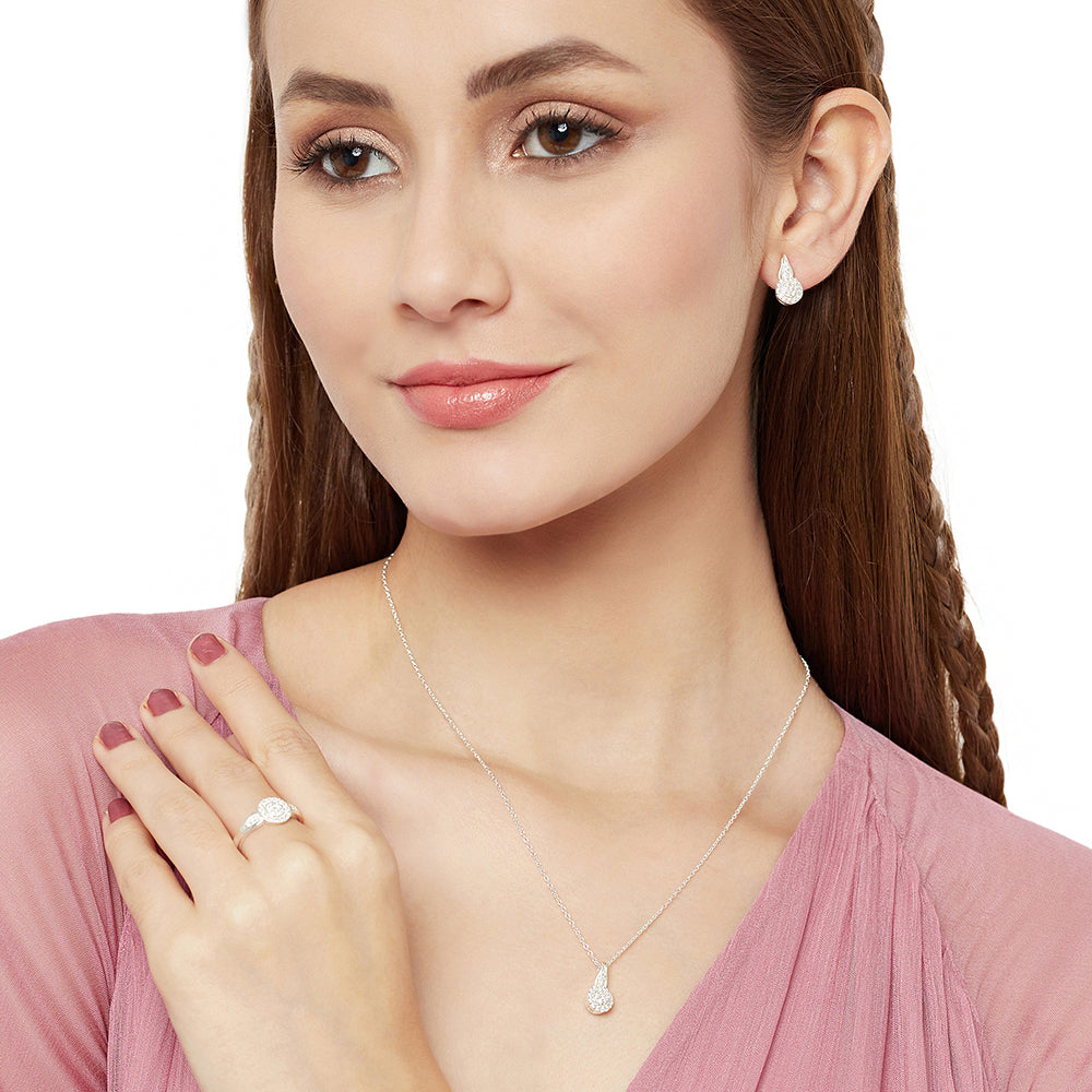 A box set featuring a pendant, earrings and a ring in a pretty design from our Silver CZ Collection. A perfect 9 to 5 piece.