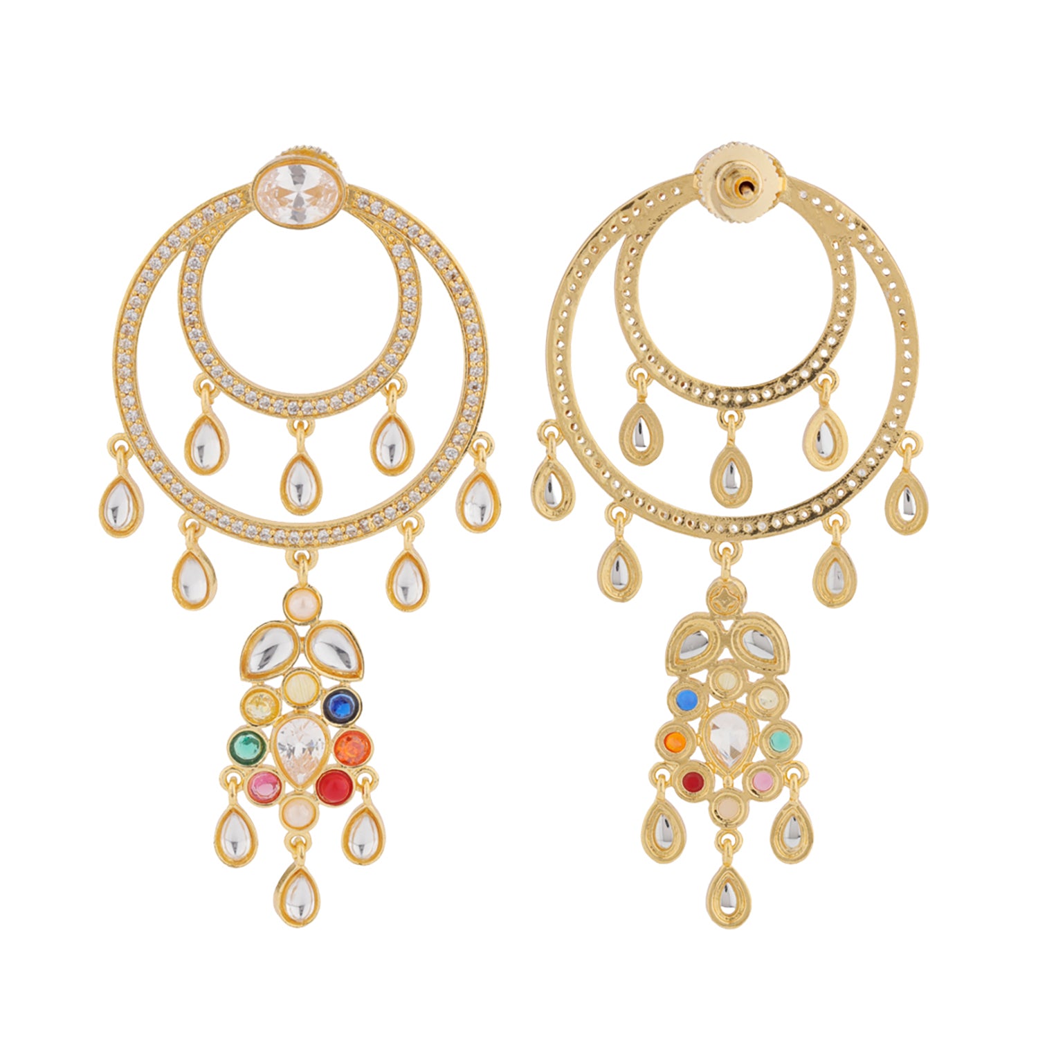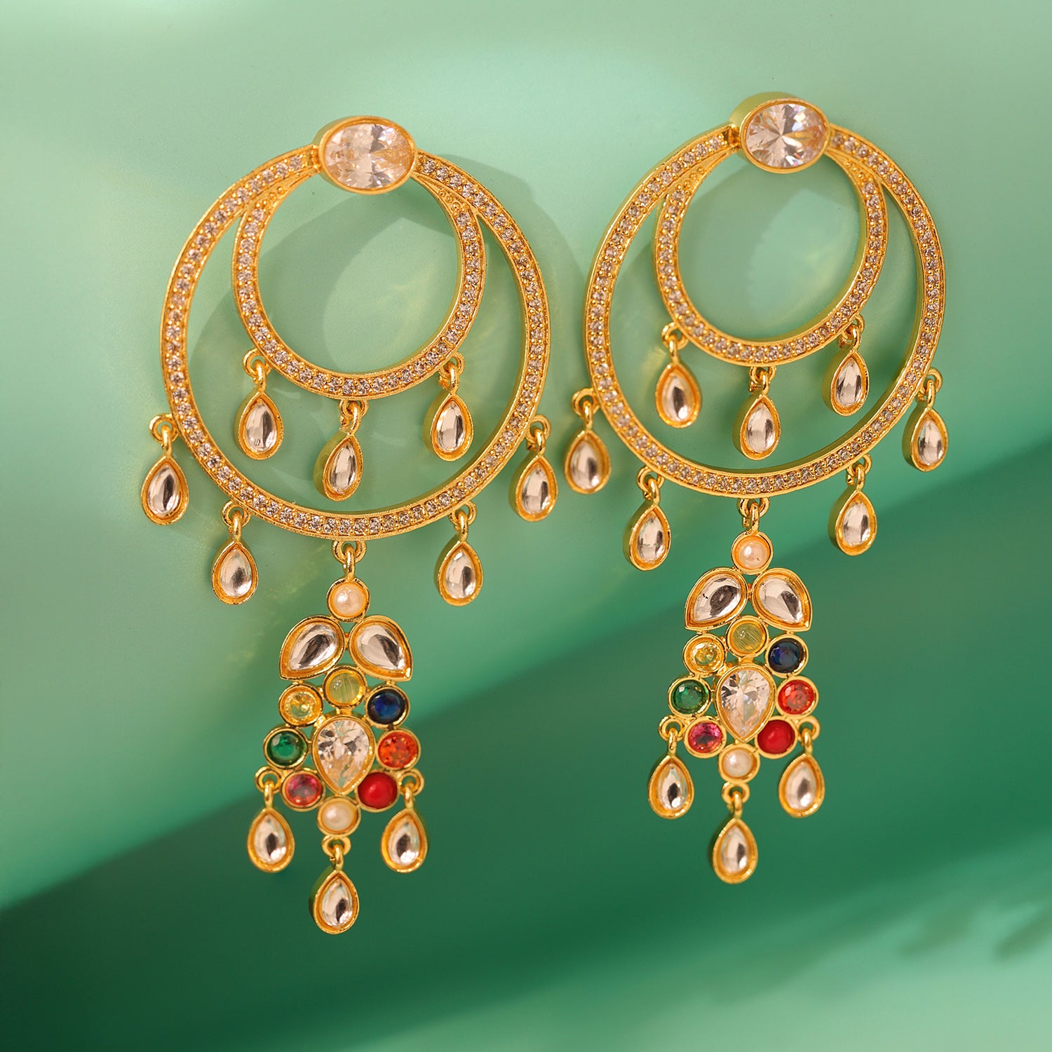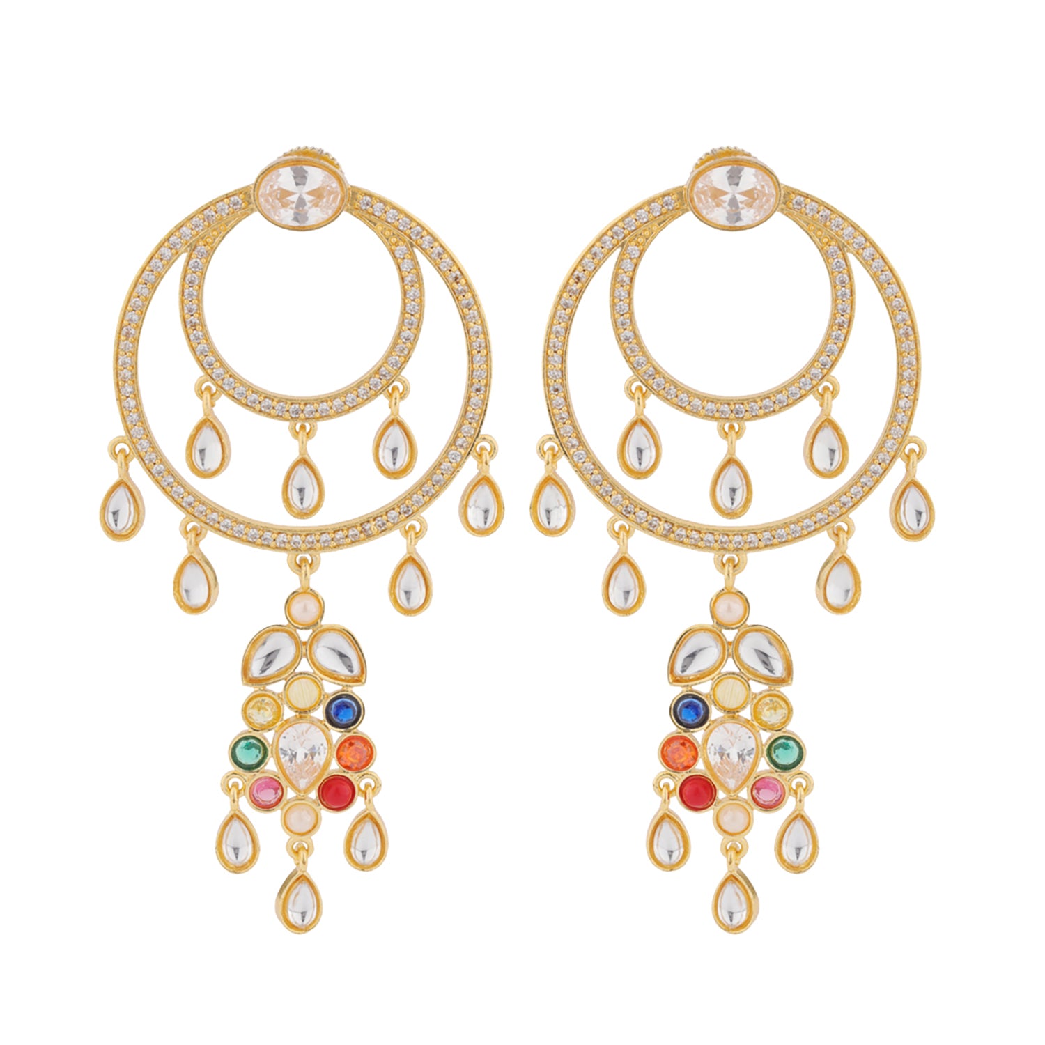 Illuminate your every celebration with the Navratan Gem Radiance Dangle Earrings, a dazzling fusion of celestial heritage and modern sophistication. Inspired by the ancient Indian Navratan tradition, the nine sacred gemstones symbolizing prosperity, balance, and protection, this piece from the Navratan Collection captures timeless grace with a contemporary twist. Crafted in brass with a luxurious yellow gold plating, these designer earrings for women are an ode to elegance and energy. The cascading design features double concentric gold hoops, encrusted with shimmering white stones and accented with delicate teardrop motifs. At the base, a striking cluster of multicolored Navratan stones adds vibrancy, symbolizing the harmony of cosmic forces in perfect unison. Graceful in movement and rich in symbolism, these gold earrings are perfect for both grand celebrations and intimate gatherings. Whether worn for a wedding, festive event, or as an elegant daily wear earring, the Navratan Gem Radiance Dangle Earrings make a statement that’s as radiant as you. They also make a heartfelt gift for women - a perfect anniversary gift, Valentine’s Day surprise, or wedding gift that celebrates love, beauty, and timeless energy.