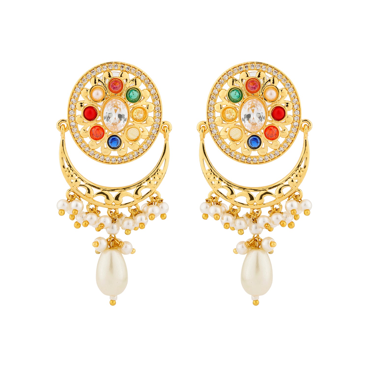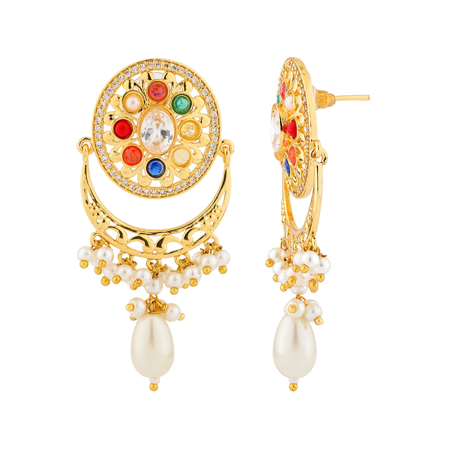 Radiate celestial charm and regal beauty with the Navratan Eternal Orbit Chandbali Earrings, a perfect blend of divine symbolism and timeless design. Inspired by the cosmic allure of the Navratans, or the nine sacred gemstones that represent harmony, energy, and prosperity, this pair from the Navratan Collection beautifully captures the essence of spiritual balance and modern luxury. Crafted meticulously in brass and finished with a radiant yellow gold plating, these designer earrings for women feature an exquisite orbital floral motif at the top, encrusted with brilliant multicolored stones symbolizing the nine planets. The graceful crescent moon design below adds a touch of sophistication, adorned with delicate pearls that move with effortless elegance. Their intricate craftsmanship and stunning color palette make them the ultimate statement piece for wedding wear, festive occasions, or even pooja wear. Lightweight yet striking, they balance traditional charm with contemporary finesse, making them an essential addition to every jewelry lover’s collection. Whether you’re looking for a radiant gift for wife, a heartfelt anniversary gift, or a luxurious Valentine’s Day gift, these gold earrings are sure to leave a lasting impression of grace, love, and luck.