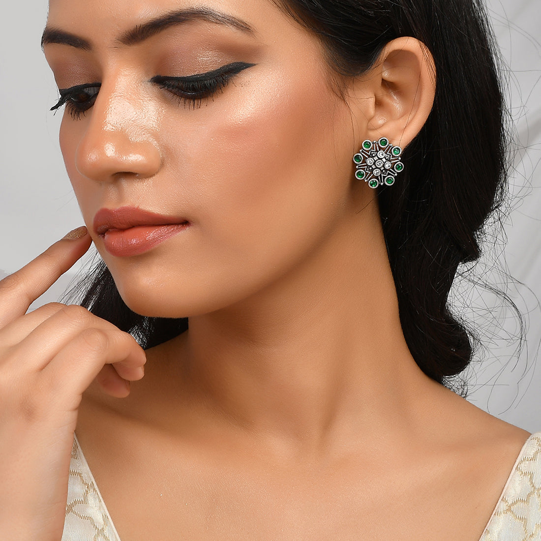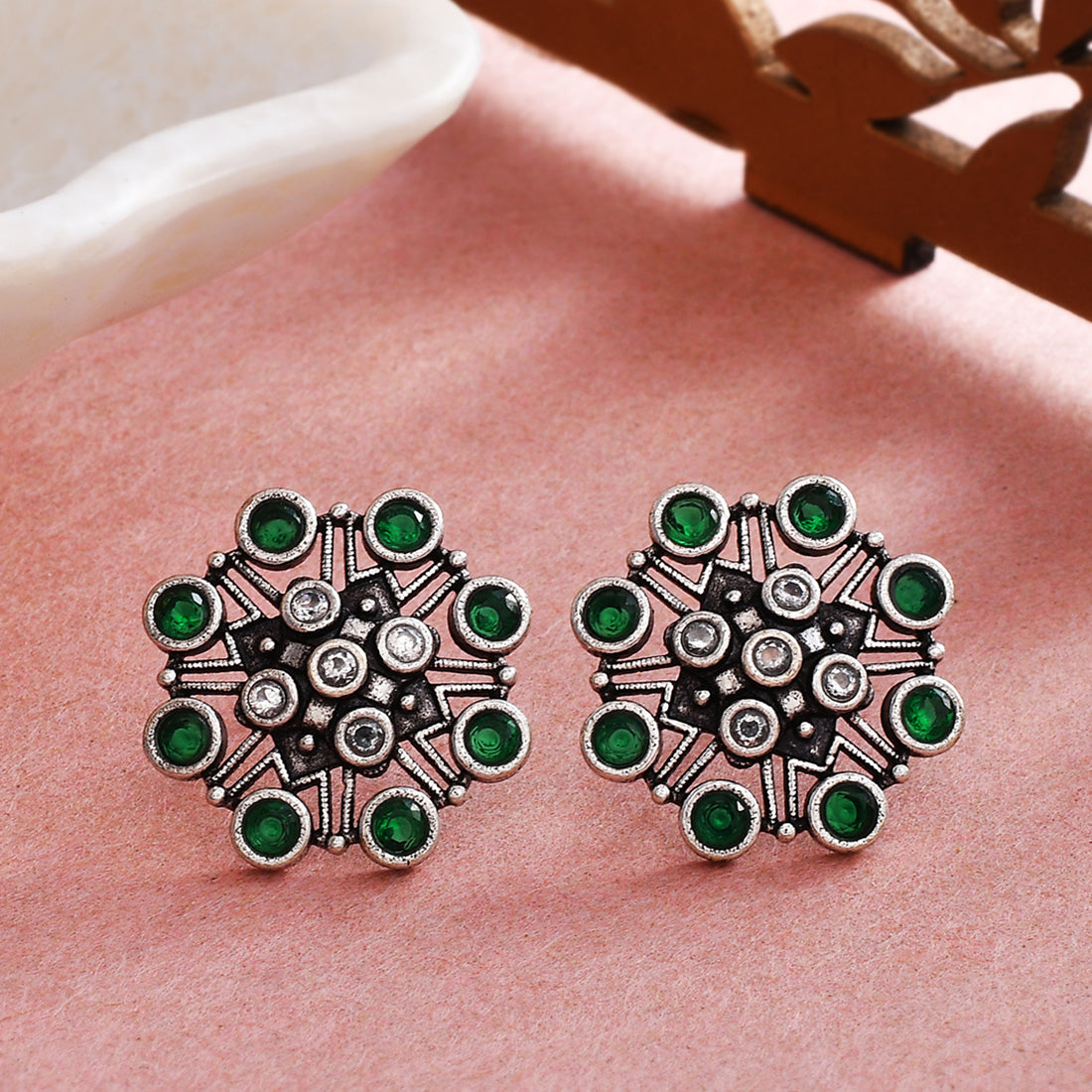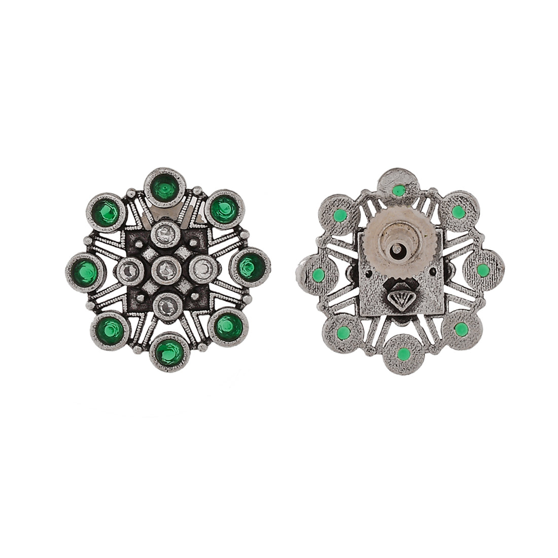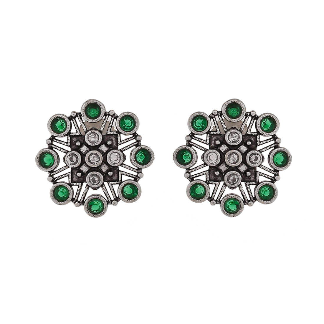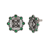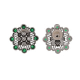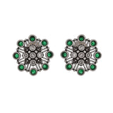 Floral stud earrings embellished with round cut green stones. Made from brass and oxidised silver plated. The earrings can be paired with just about everything.