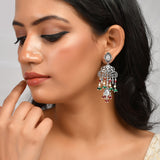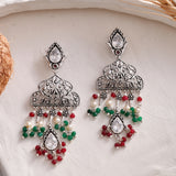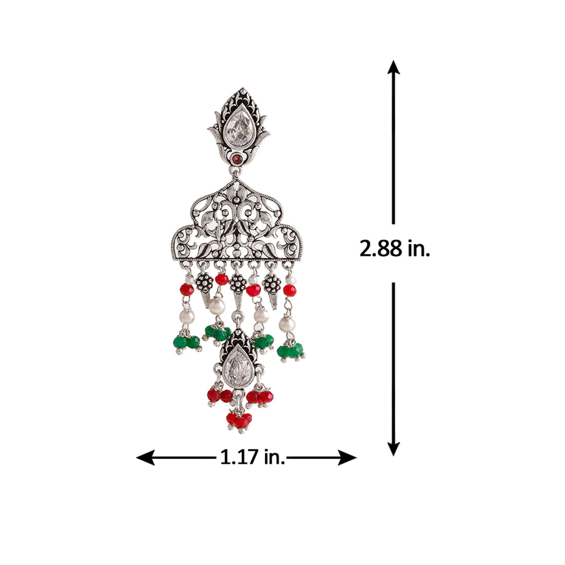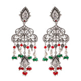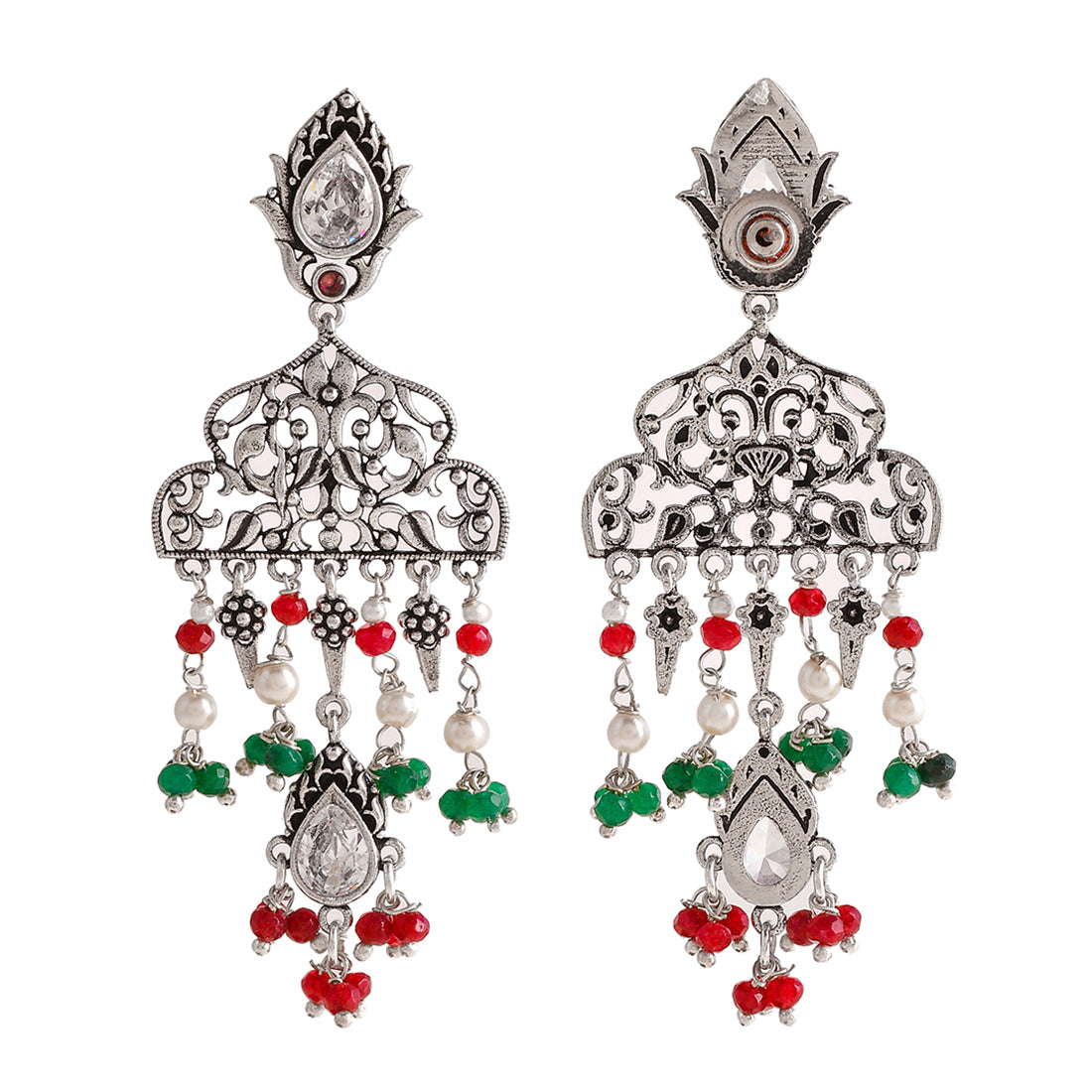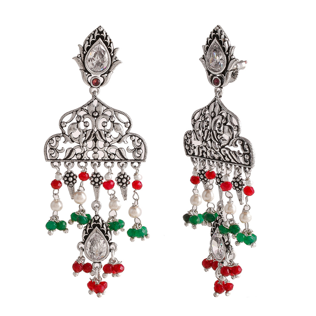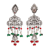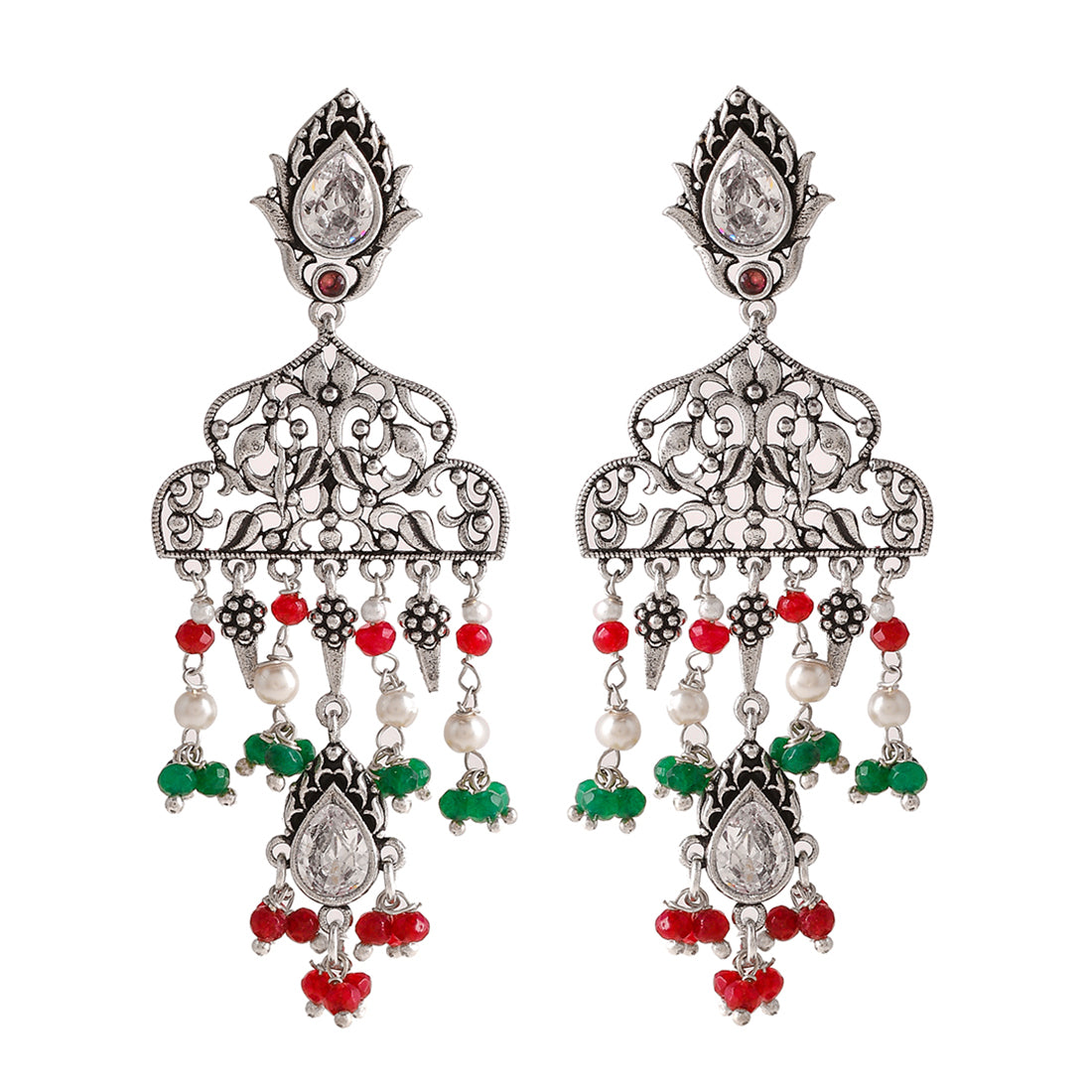 Delicate filigree pattern drop earrings made from brass. Lightly embellished and oxidised silver plated. Good for ethnic looks.