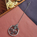 White pearls adorned floral motifs maang tika, made from brass and yellow gold plated. Pair with formal ethnic looks.