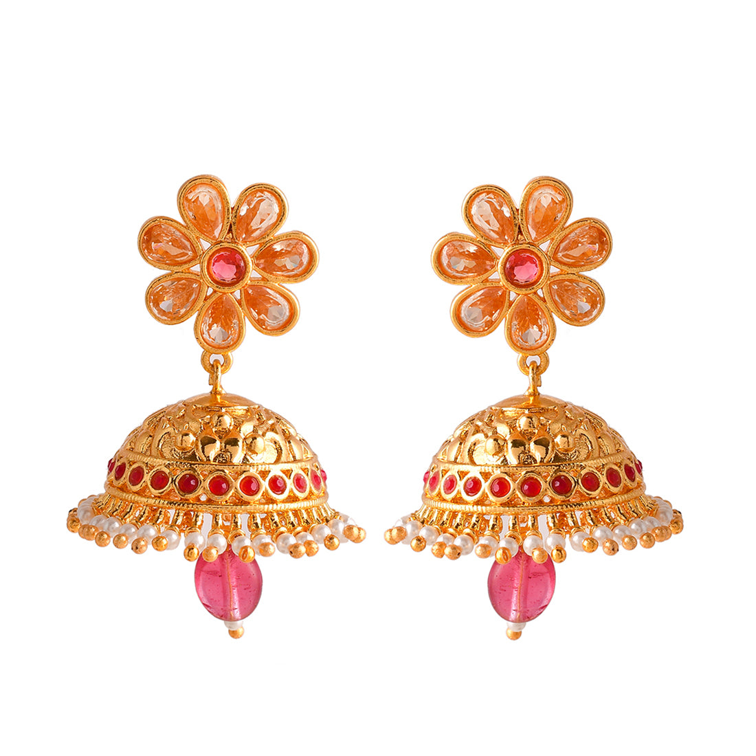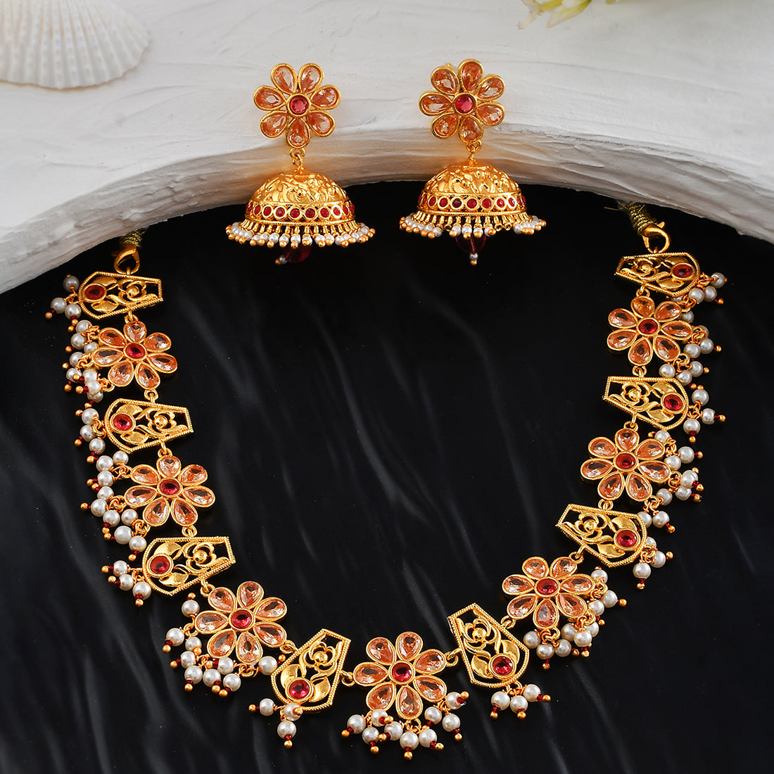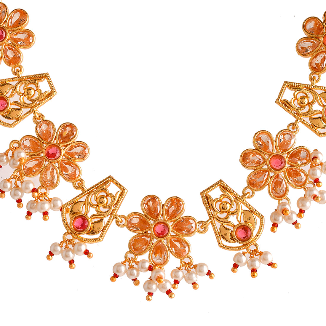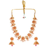 Abharan Pink Teardrop Cut Stones and Pearls Floral Jewellery Set