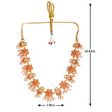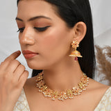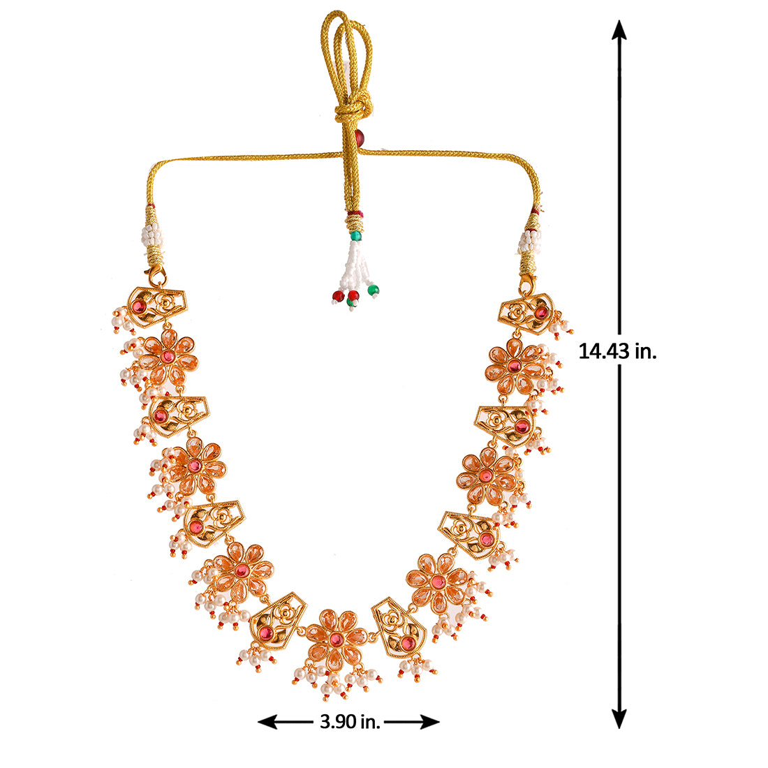 Floral motif jewellery set, made from brass and yellow gold plated. Embellished with teardrop cut pink stones and white pearls. Pair with formal ethnic looks.