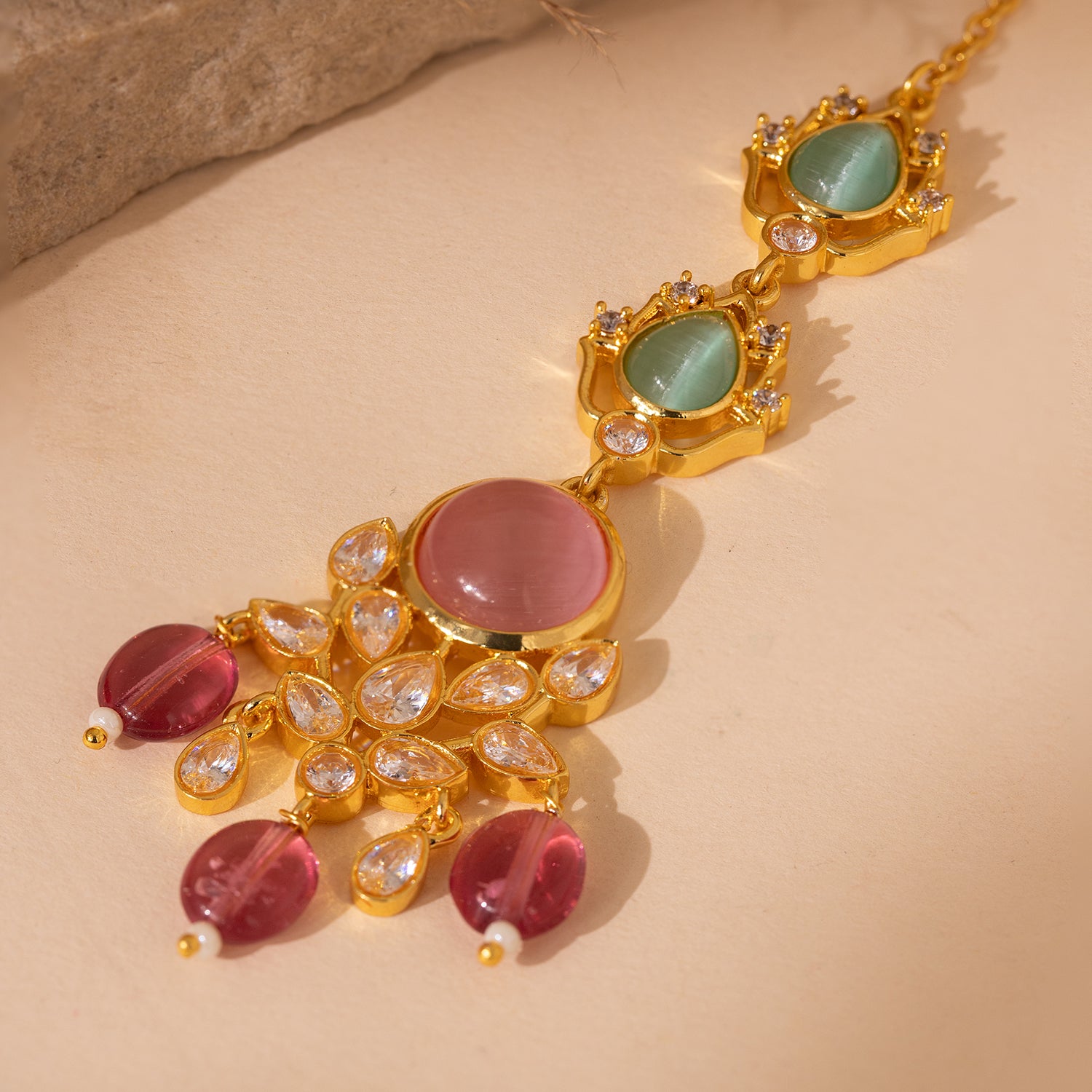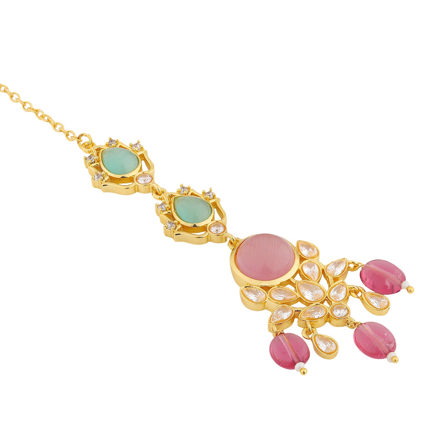 Gracefully vibrant and royally inspired, the Queens of Rajasthan Siaara Maang Tikka is a celebration of colour, heritage, and timeless elegance. Part of the majestic Queens of Rajasthan collection, this piece draws inspiration from palace rituals and the jewellery once worn by Rajput queens where every ornament told a story of grace and celebration. Crafted in premium brass and finished with radiant yellow gold plating, the Siaara Maang Tikka features a striking arrangement of coloured stones paired with classic kundan detailing. The soft pink and serene green tones bring a refreshing charm to this maang tikka for women traditional, while the delicate drop elements add movement and femininity. Despite its statement look, the design remains lightweight and comfortable, making it ideal for long wedding ceremonies and festive occasions. Perfect as a bridal mangtika, this piece also works beautifully for bridesmaids and women who want to add a pop of colour to their traditional look. Whether paired with lehengas, sarees, or festive outfits, the Siaara Maang Tikka adds a regal finishing touch rooted in Rajasthani jewellery traditions.