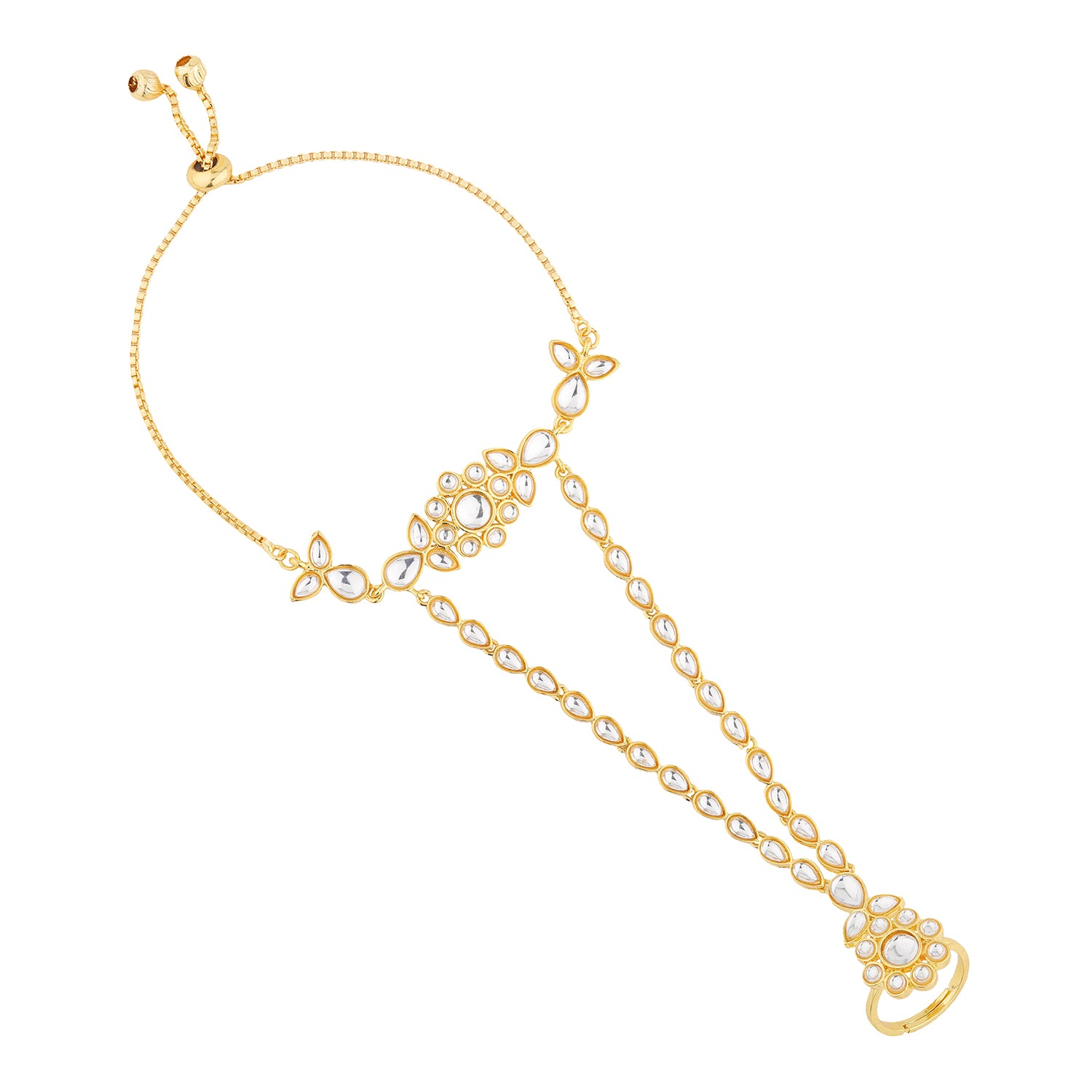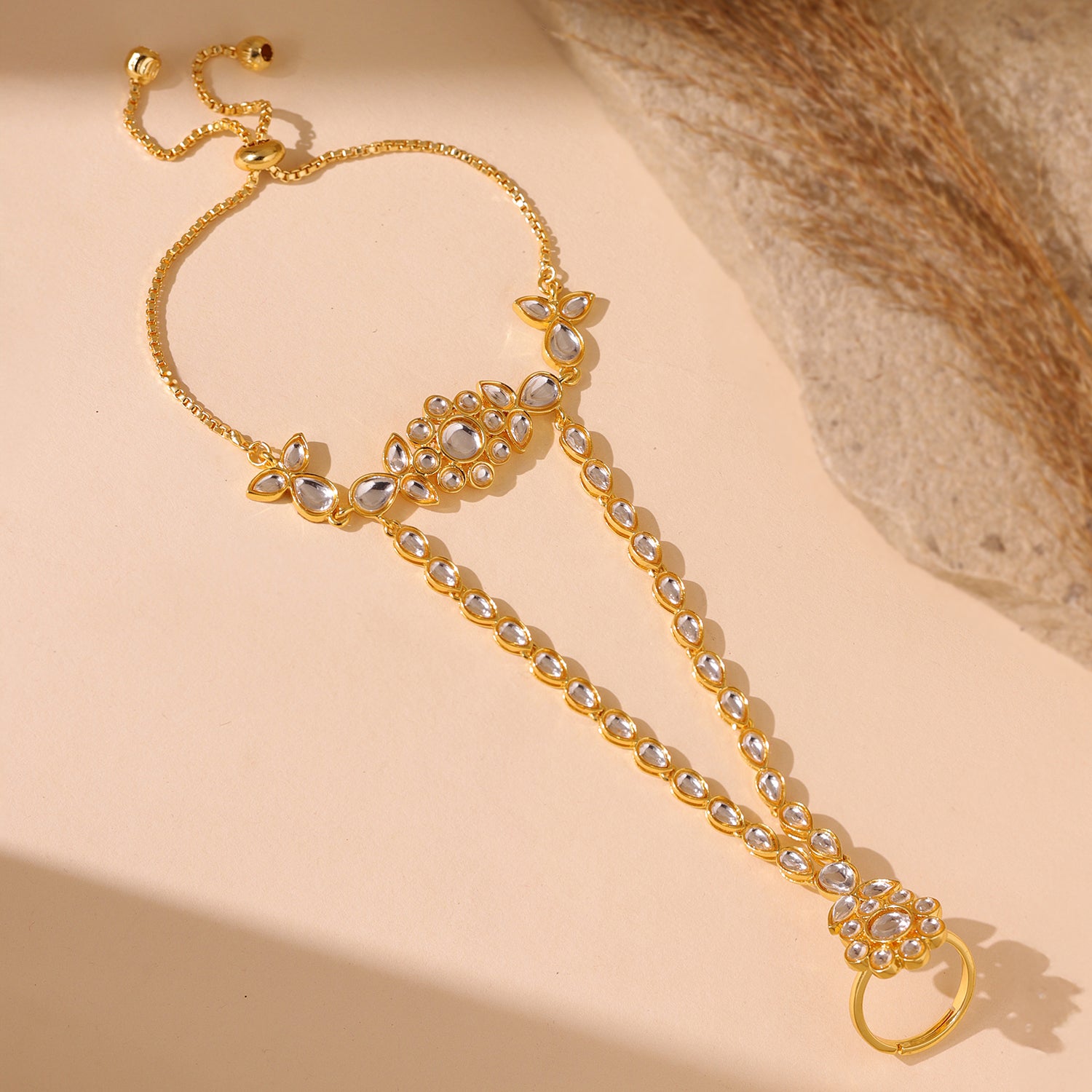 Step into the world of royal elegance with the Queens of Rajasthan Veeraya Hathphool, a timeless expression of heritage-inspired beauty designed for today’s modern woman. Part of the majestic Queens of Rajasthan collection, this exquisite hathphool jewellery for women draws inspiration from Rajasthan’s legendary kings and queens, their opulent courts, and the enduring charm of traditional Jaipuri jewellery. Crafted thoughtfully in premium brass and finished with rich yellow gold plating, this gold hathphool for women showcases classic kundan artistry in a refined hand harness silhouette. The elegant chain connects the finger ring to the bracelet, creating a graceful flow that enhances the beauty of your hands. The design feels regal yet lightweight, making it comfortable for long wedding functions and celebrations. Perfect as a bridal hathphool, this piece adds a royal finishing touch to bridal lehengas, sarees, and festive ensembles. It is equally beautiful as a hathphool for bridesmaid, offering coordinated elegance for wedding parties. Whether worn during mehendi, sangeet, engagement ceremonies, or festive occasions, this hathphool brings effortless sophistication and timeless charm. The warm golden tone pairs beautifully with both pastel shades and rich jewel-toned outfits, making it a versatile addition to your jewellery collection. Designed for women who love meaningful jewellery, the Veeraya Hathphool also complements other accessories like bracelets for women, kundan earrings, and statement necklaces for a complete royal look. If you are looking for a thoughtful gift for bride, a memorable gift for bridesmaid, or elegant gifts for woman who appreciates heritage craftsmanship, this piece makes a heartfelt choice. Rooted in tradition yet styled for modern sensibilities, it is jewellery that tells a story of culture, celebration, and individuality.