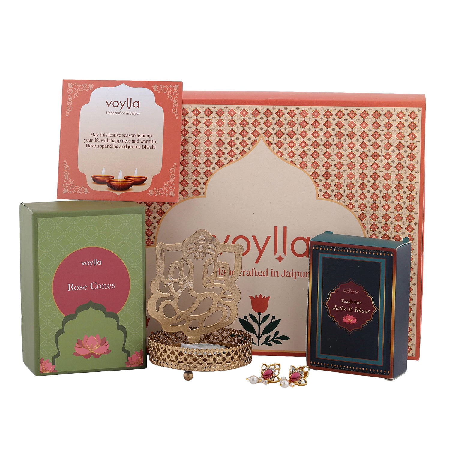 Bring joy, light, and togetherness to your celebrations with the Voylla Festival Fun Diwali Celebration Box, a thoughtfully curated Diwali hamper that combines tradition, fragrance, entertainment, and elegance. Designed as a perfect Diwali gift for family, friends, or loved ones, this festive gift hamper is a complete celebration in a box. Inside, you’ll find a beautifully crafted Kuber Diya, symbolizing wealth, blessings, and auspicious beginnings, along with Rose Dhoop Incense Sticks that fill your space with calming fragrance during prayers and festive evenings. To add an element of family fun, the hamper includes a special Jashn-e-Tyohar Playing Cards Deck, perfect for bonding moments over games during the holidays. Adding a touch of elegance, the Voylla Heer Shabnam Ear Studs bring timeless style and tradition, making this hamper a gift that lasts beyond the festival. Completing the box is a customizable Diwali Greeting Card so you can share heartfelt wishes in a personal way, all beautifully presented in a premium Maroon Sleeve Gift Box that’s ready to gift. Whether you need an instant Diwali gift, an express festive gifting option, or a traditional Diwali hamper, the Voylla Festival Fun Diwali Celebration Box makes celebrations brighter, warmer, and truly unforgettable.