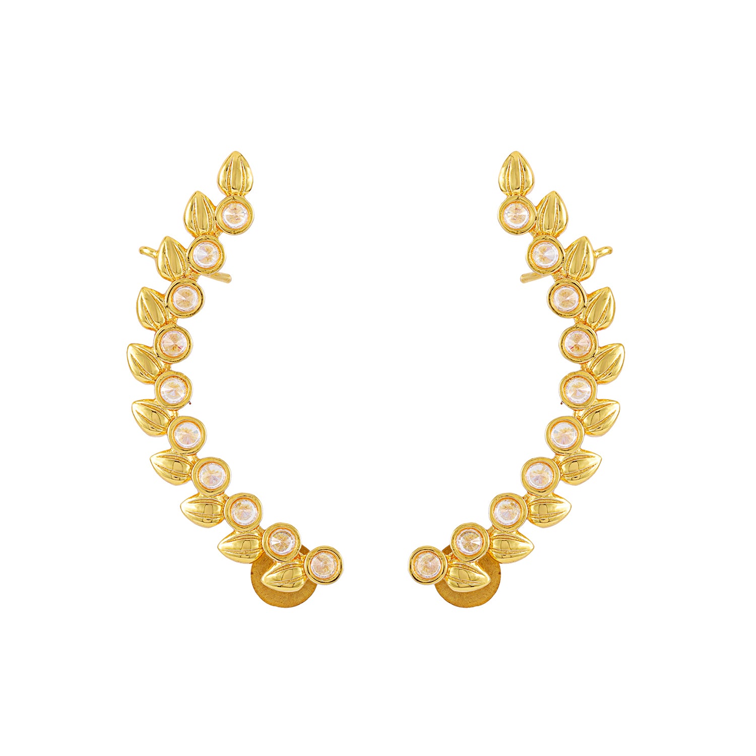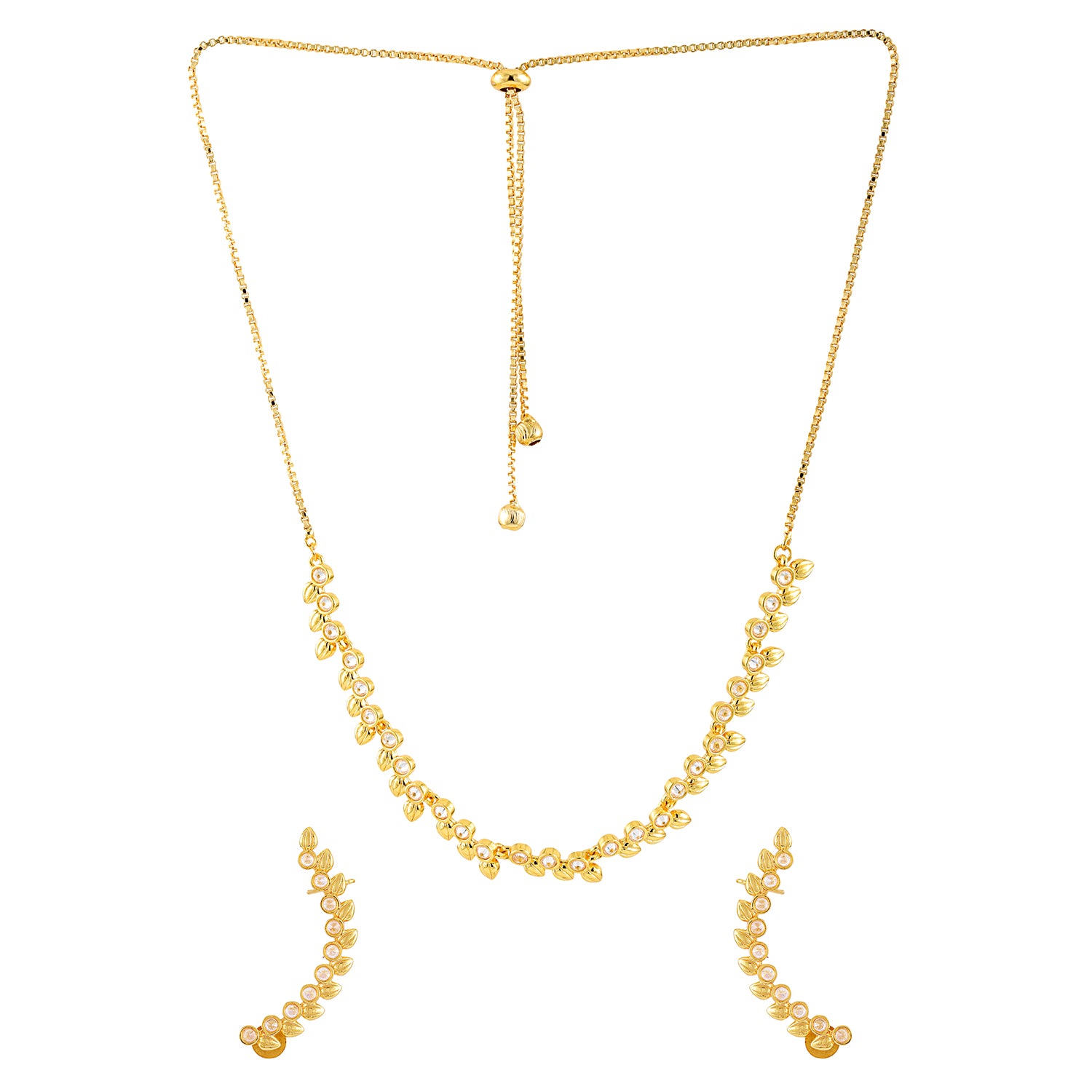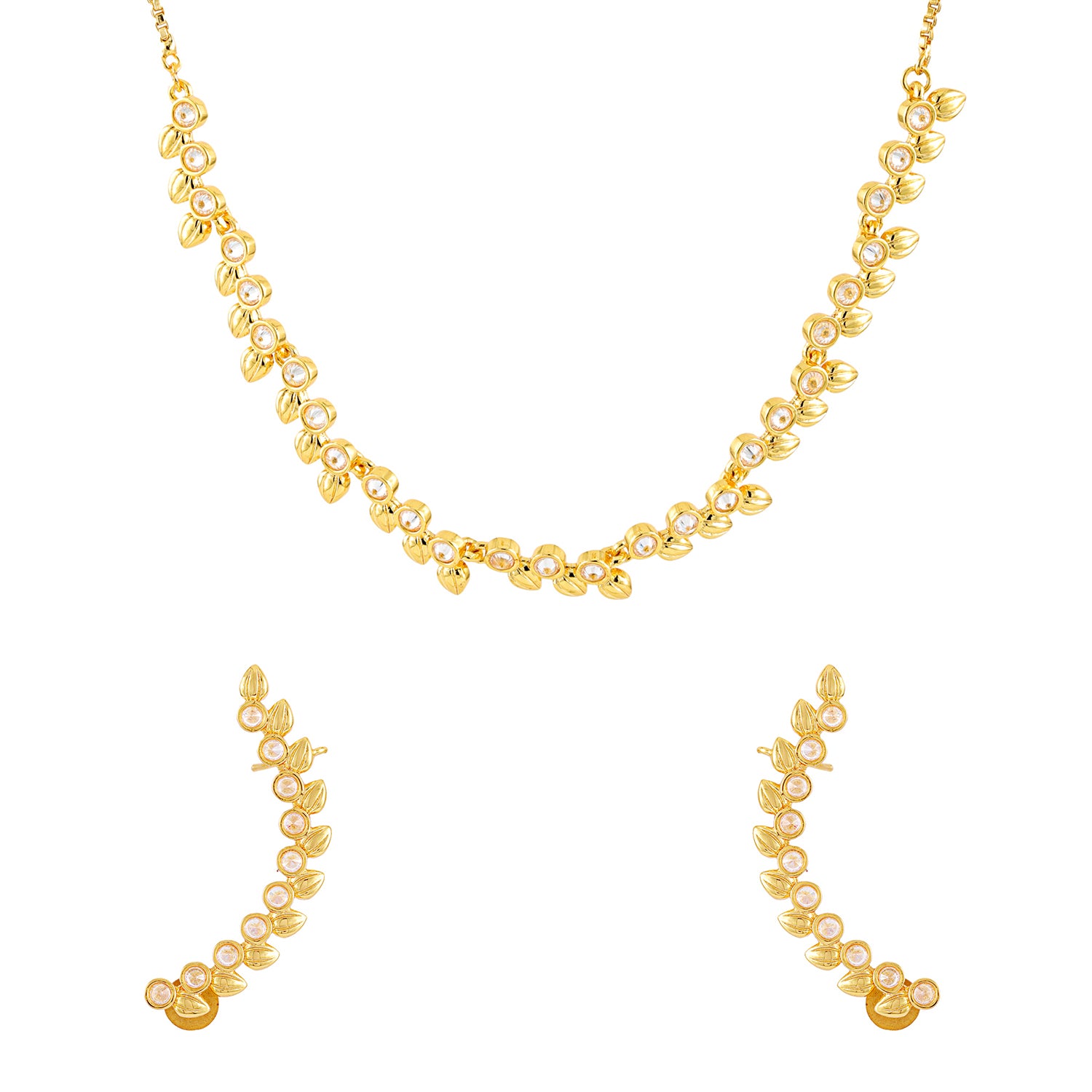 Graceful, minimal, and timelessly festive, the Gota Patti Latika Pushp Necklace Set With Cuff Earrings is the perfect blend of simplicity and royalty. Handcrafted in fine brass, the set features a delicate floral-inspired chain necklace, with alternating golden petals and sparkling reverse AD stones arranged in a continuous vine-like design. Paired with matching floral cuff-style earrings that curve elegantly along the ear, the set offers both sophistication and modern charm. Part of the Gota Patti Collection, this festive jewellery necklace set is inspired by the delicate motifs of Rajasthan’s embroidery, reimagined into jewellery that feels regal yet easy to wear. Designed as a versatile ethnic enamel necklace set, it is perfect for weddings, poojas, festive gatherings, or even as a subtle statement for evening events. The Latika Pushp Necklace Set also makes a wonderful jewellery gift for women, a timeless gift for her, a festive present for your sister, or a cute gift for girlfriend who loves chic necklace sets with a royal story to tell.