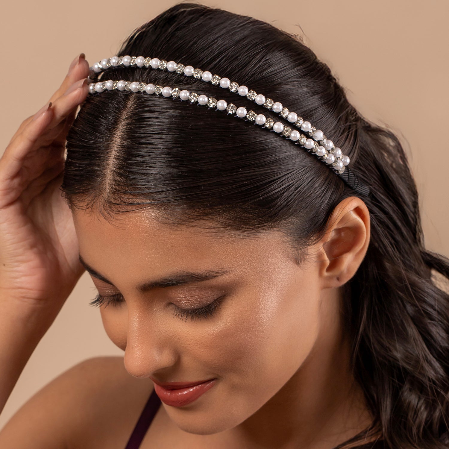 Bring sparkle and sophistication to your hairstyle with the Korean Bling Twilight Pearl Headband. A standout piece from the Korean Bling collection, this Korean style hairband combines the timeless elegance of pearls with the shimmer of rhinestones, creating a trendy fashion headband that doubles as a piece of Korean statement hair accessories. Crafted with a durable alloy base and finished with sleek white rhodium plating, this headband offers both comfort and glam in one accessory. This trendy headband for women is perfect for multiple occasions. The pearl and crystal detailing makes it ideal for weddings, festive events, or parties, while its lightweight and comfortable design means it works beautifully as an everyday wear hairband. Whether paired with sleek buns, loose waves, or ponytails, this stylish hairband adds instant elegance to any look. It’s also a thoughtful gift for her, a chic hairband gift for birthdays, anniversaries, or festive celebrations. Whether you’re buying a gift for girlfriend, looking for jewellery gifts for women, or simply want a timeless women gift, this cute headband is the perfect choice.