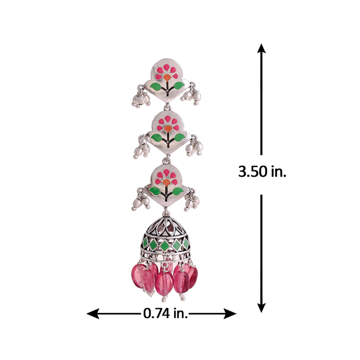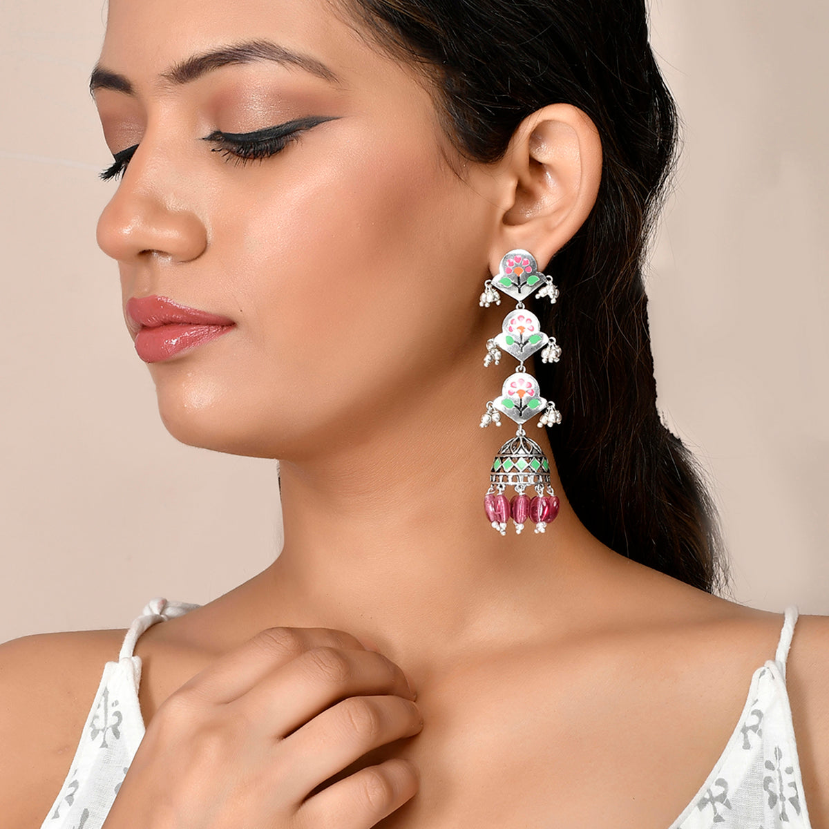 The breezy pastel jhumka drop earrings are truly inspired by the Sanganeri floral prints . Made from nickel-free brass and finished with exotic enamelling. Pair with an ethnic summer wear.Weight (Gms): 28.86Size (LxW)(Inch): 3.65*0.85Material: BrassPlating: Silver PlatingColor: SilverSales Package: 2...