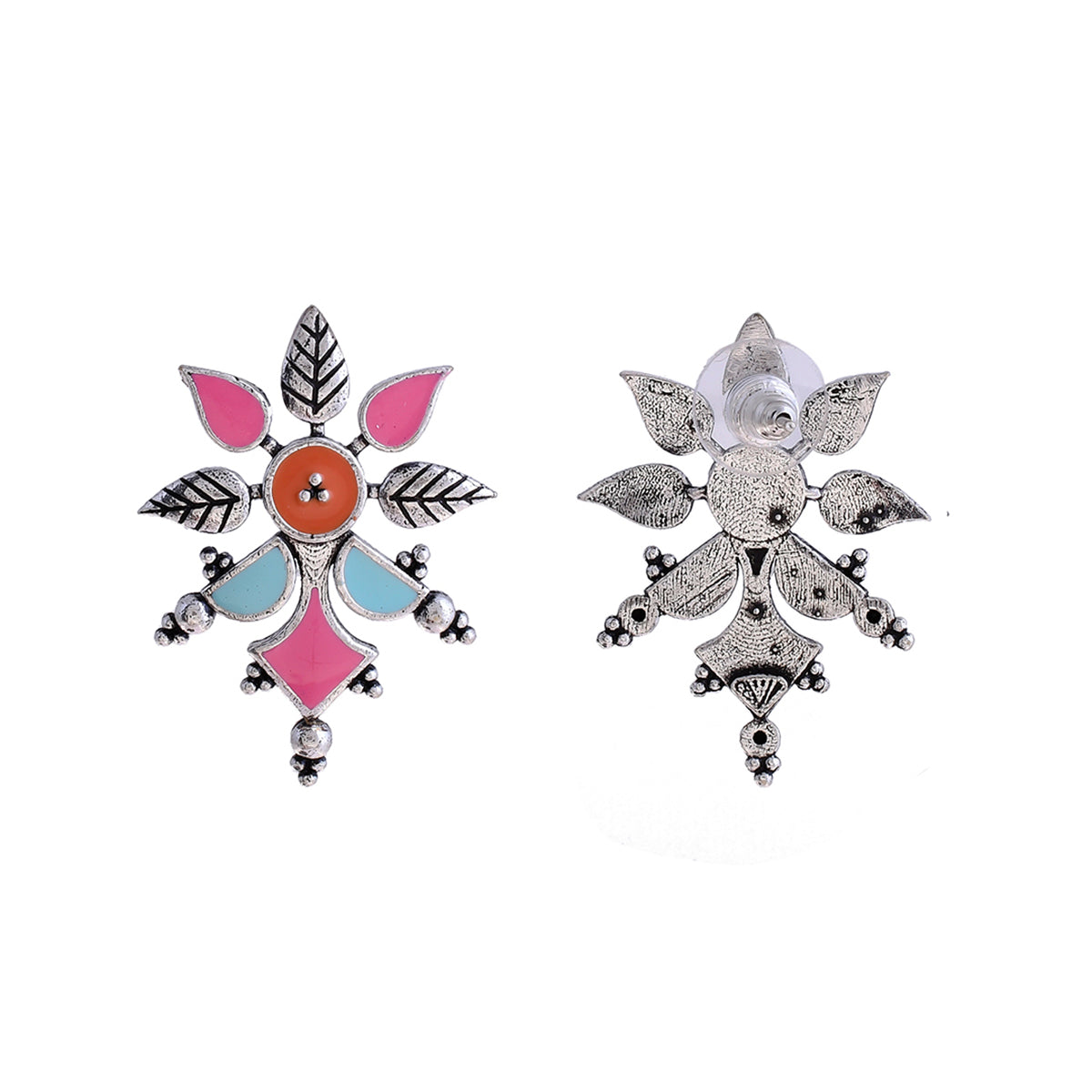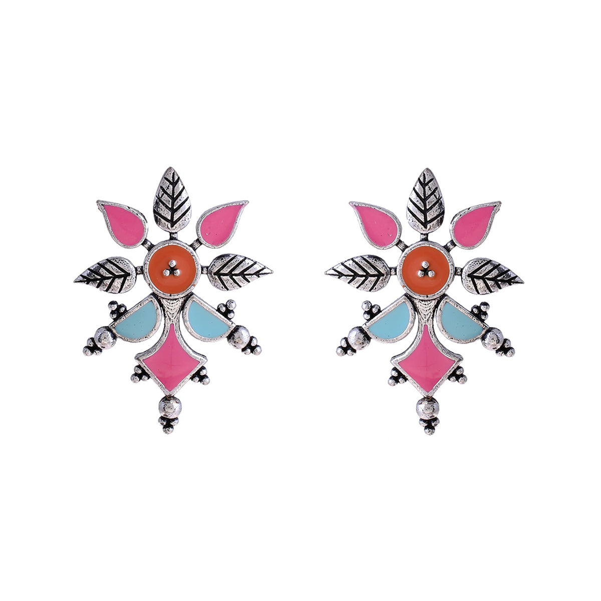The Rangoli style colorful earrings are inspired by the Sangari block printing. It's summer fresh hand enamelled colours makes this earirng a must have this season.Weight (Gms): 10Size (LxW)(Inch): 1.65*1.25Material: BrassPlating: Silver PlatingColor: SilverSales Package: 2 EarringsProduct Code: 8907617929088
