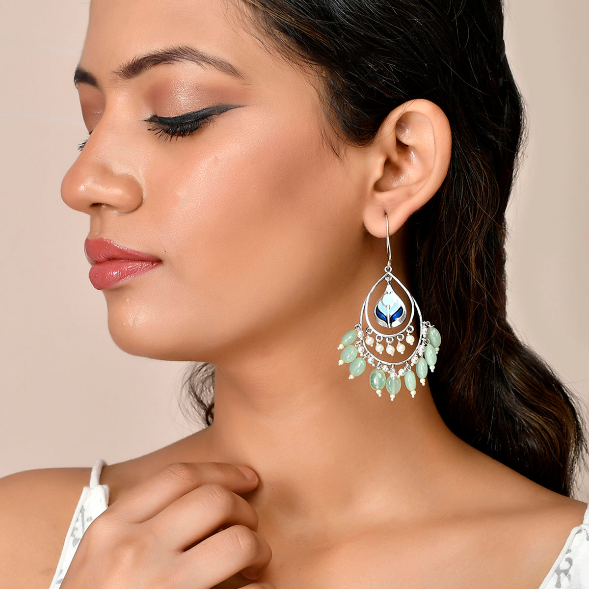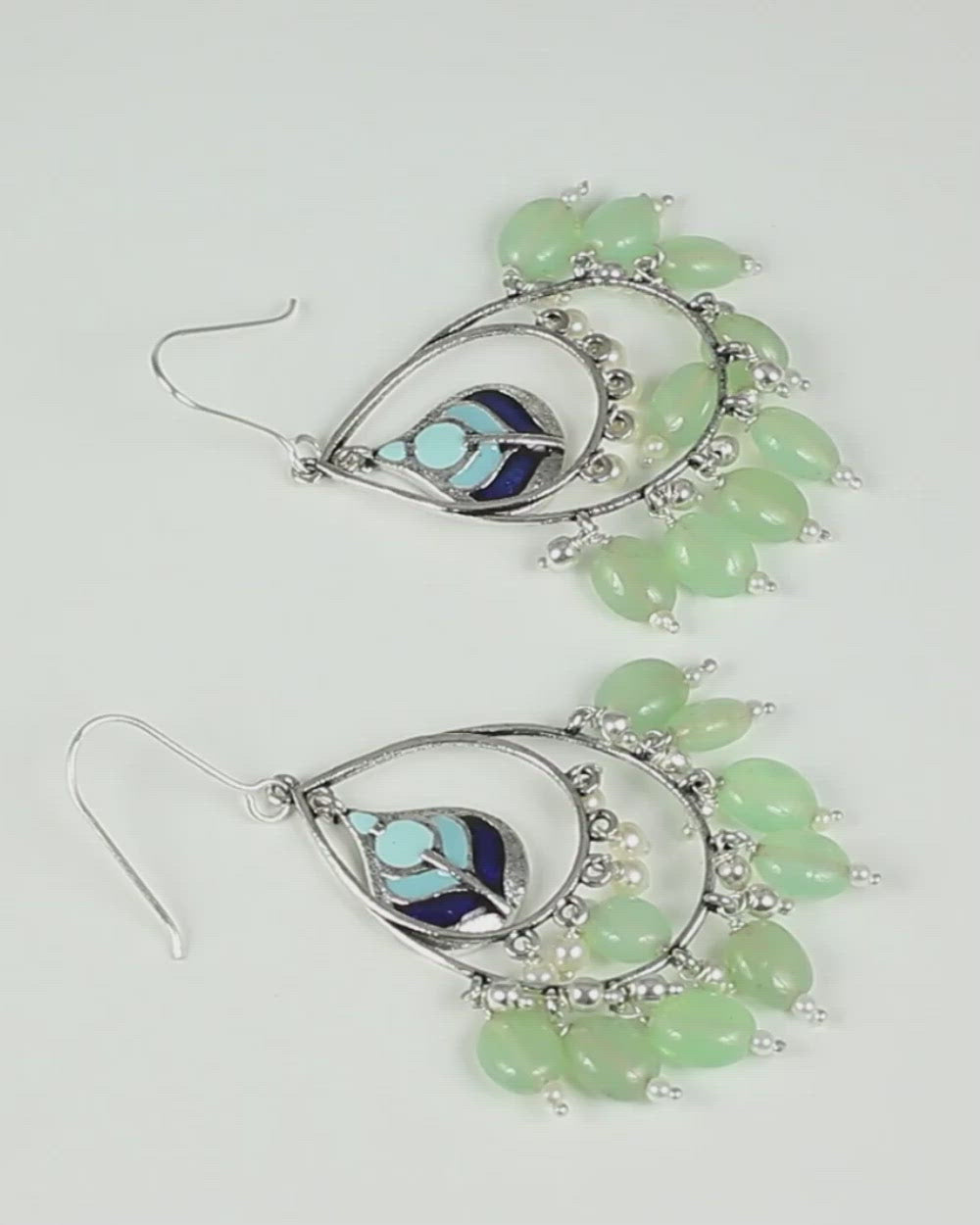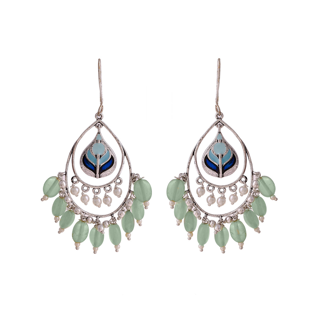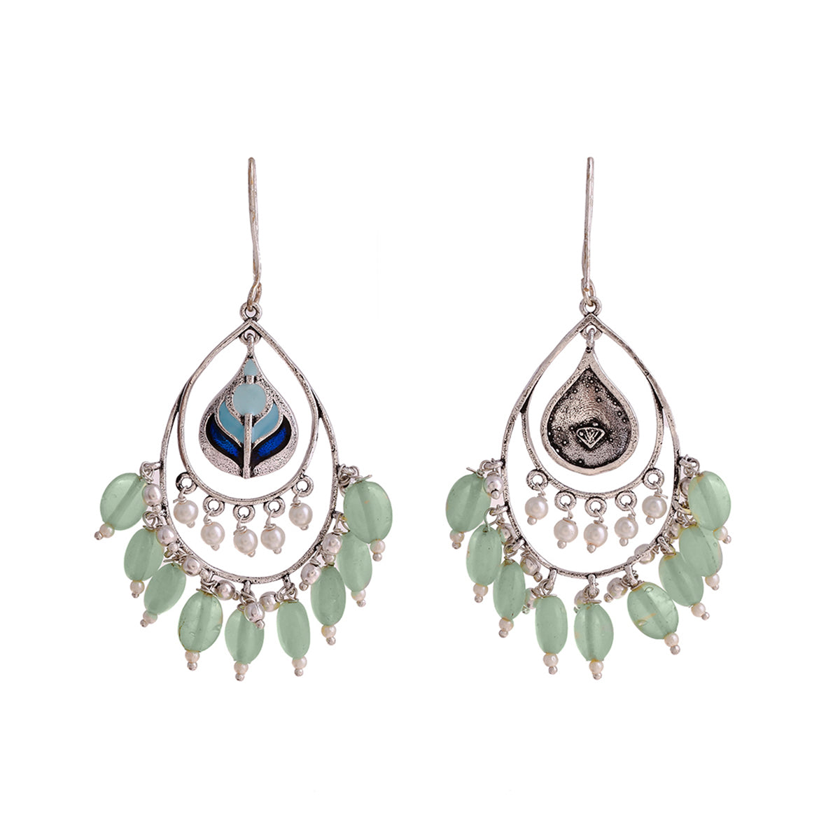 Green beads embellished drop earrings inspired by block printing. Made from brass and silver plated. Wear with ethnic attire.Weight (Gms): 17.88Size (LxW)(Inch): 2.75*2Material: BrassPlating: Silver PlatingColor: SilverSales Package: 2 EarringsProduct Code: 8907617929460