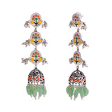 Green beads embellished drop earrings inspired by block printing. Made from brass and silver plated. Wear with ethnic attire.Weight (Gms): 17.88Size (LxW)(Inch): 2.75*2Material: BrassPlating: Silver PlatingColor: SilverSales Package: 2 EarringsProduct Code: 8907617929460