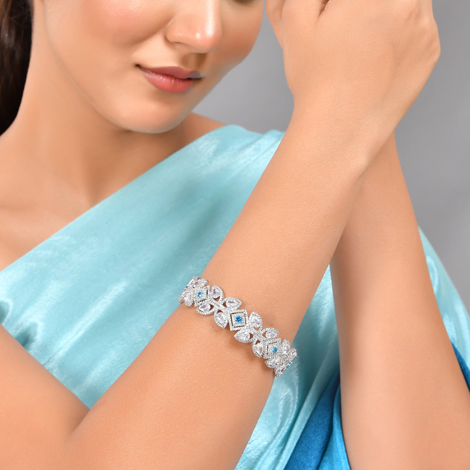 An opulent Bangles embellished with diamond and teardrop cut zirconia gemstones, inspired by the sparkle and beauty of the morning dew. Made from brass and silver plated, the bracelet is lightweight, comfortable and versatile.Weight (Gms): 62.44Size (LxW)(Inch): 7.1*6.5Material: BrassPlating: White...
