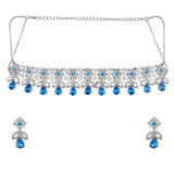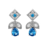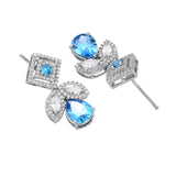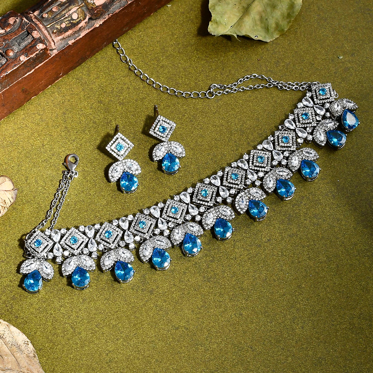Inspired by the morning dew and the beauty of dawn, this lovely jewellery set has been fashioned out of brass. Teardrop and diamond cut sky blue and white zirconia gems adorn the rhodium plated necklace and earrings. Pair with a formal gown.