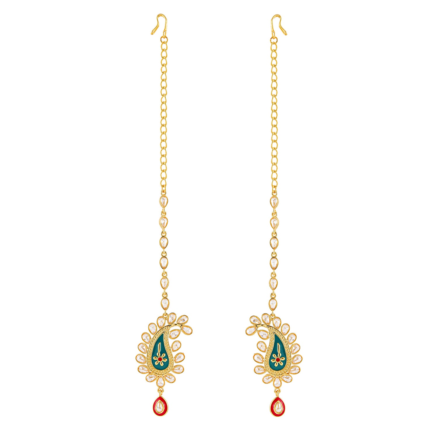 Introducing the Gota Patti Shahi Rangrez Earrings, a celebration of regal artistry and festive elegance. Handcrafted in fine brass, these exquisite dangler earrings feature a paisley-inspired teardrop adorned with vibrant green enamel, encircled by shimmering reverse AD stones, and finished with a bold red enamel drop. The elongated stone-studded chain adds a touch of luxury, creating a look that is both graceful and dramatic. Each detail reflects the grandeur of Rajasthan’s royal heritage, reimagined for the modern woman who loves to embrace tradition with a contemporary touch. Designed as festive statement earrings, the Shahi Rangrez pair is perfect for wedding wear, festive soirées, and pooja rituals. Their lightweight silhouette and striking color palette make them a versatile addition to your jewellery collection, whether styled with a silk saree, a brocade lehenga, or an elegant fusion ensemble. More than just ethnic wear earrings, these are timeless keepsakes, ideal as a thoughtful jewellery gift for women, a memorable gift for her, or a charming gift for girlfriend. With their radiant colors and royal detailing, the Shahi Rangrez Earrings promise to make every occasion unforgettable.