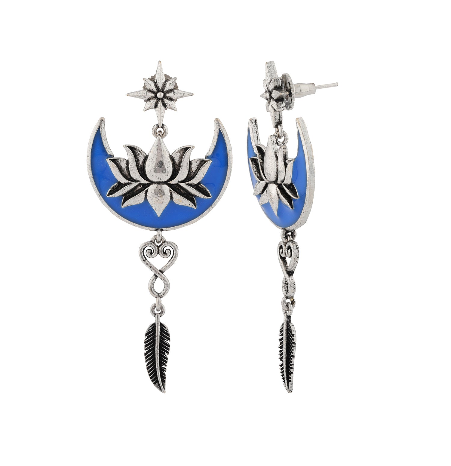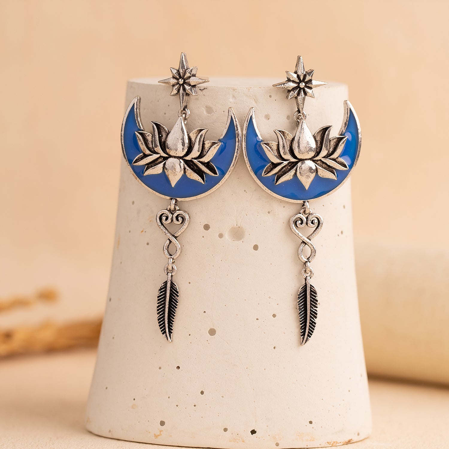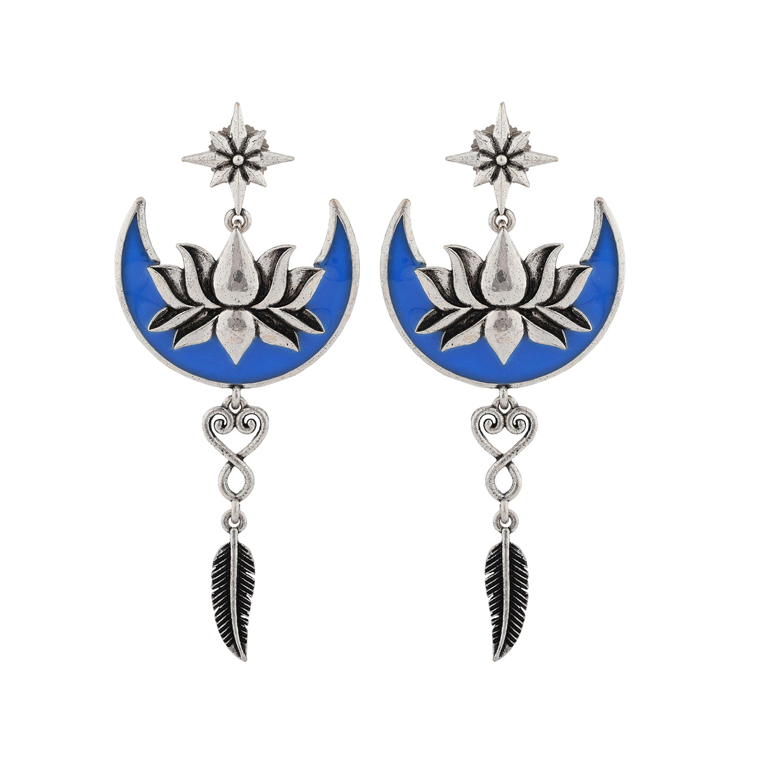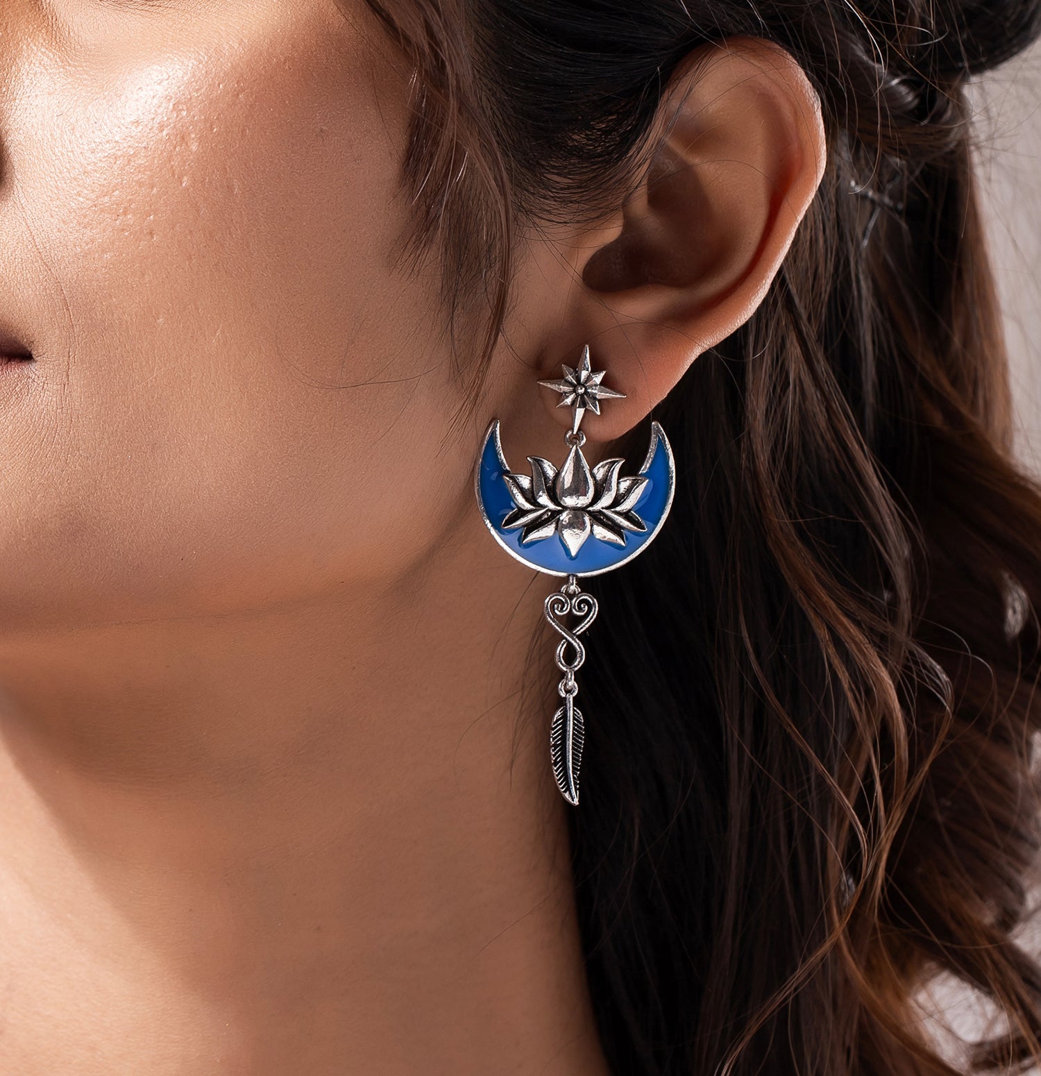 The Boho Tribe Celestial Bloom Oxidised Dangle Earrings are a stunning blend of intricate design and high-quality craftsmanship. Made from brass with a silver oxidised plating, these earrings feature a celestial motif with a star at the top, a crescent moon adorned with a blooming lotus flower, and a dangling feather charm. The vibrant blue enamel adds a pop of color, making these earrings a perfect statement piece for any outfit. Ideal for everyday wear, vacation, or special occasions like Holi, Diwali, Rakshabandhan, and Valentine's Day, these earrings make a thoughtful gift for women, whether it's for a sister, girlfriend, wife, mother, or friend. The Boho Tribe collection draws inspiration from the free-spirited, tribal, and ethnic bohemian culture, offering a unique and chic addition to your jewelry collection. Pair these earrings with casual or formal attire to elevate your style effortlessly.