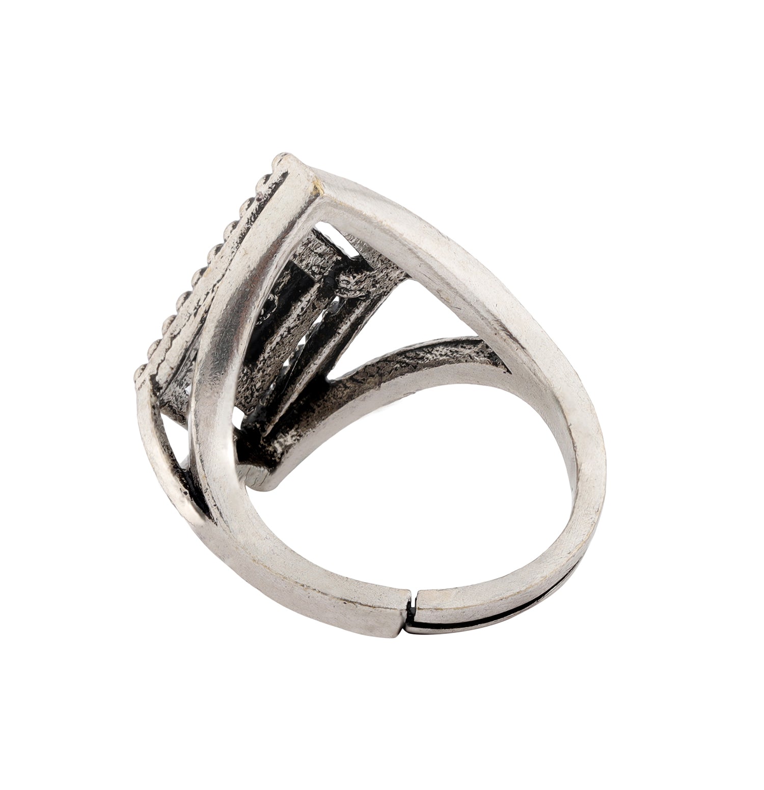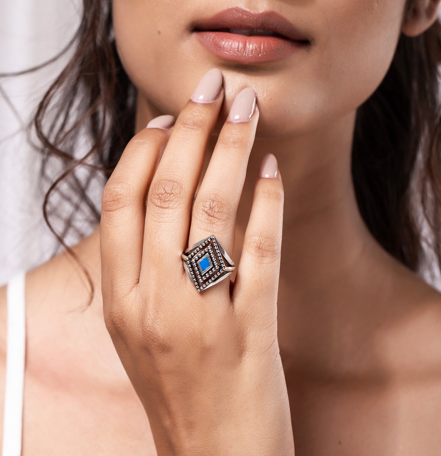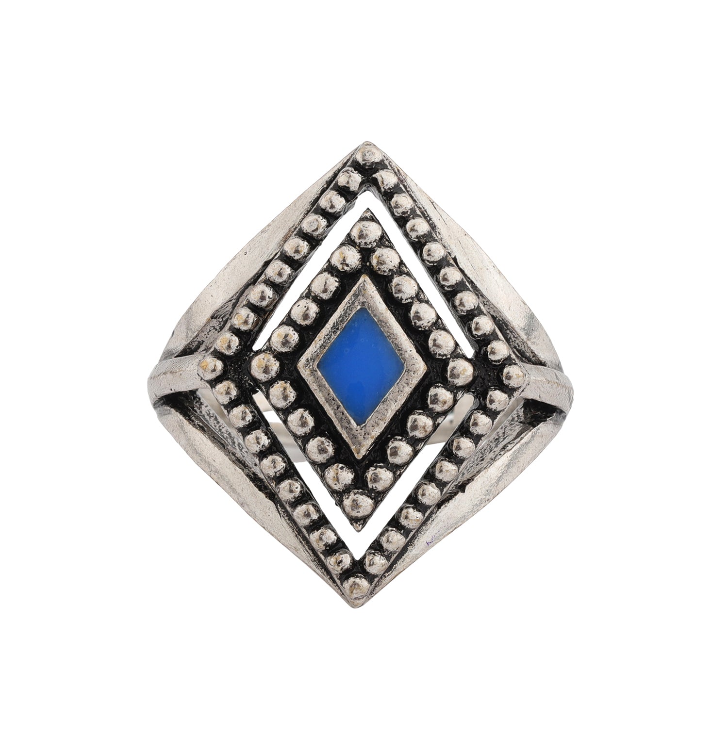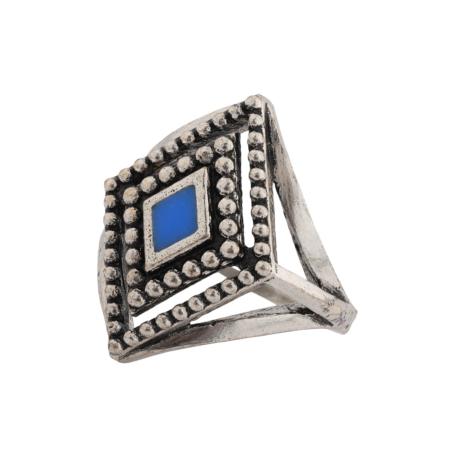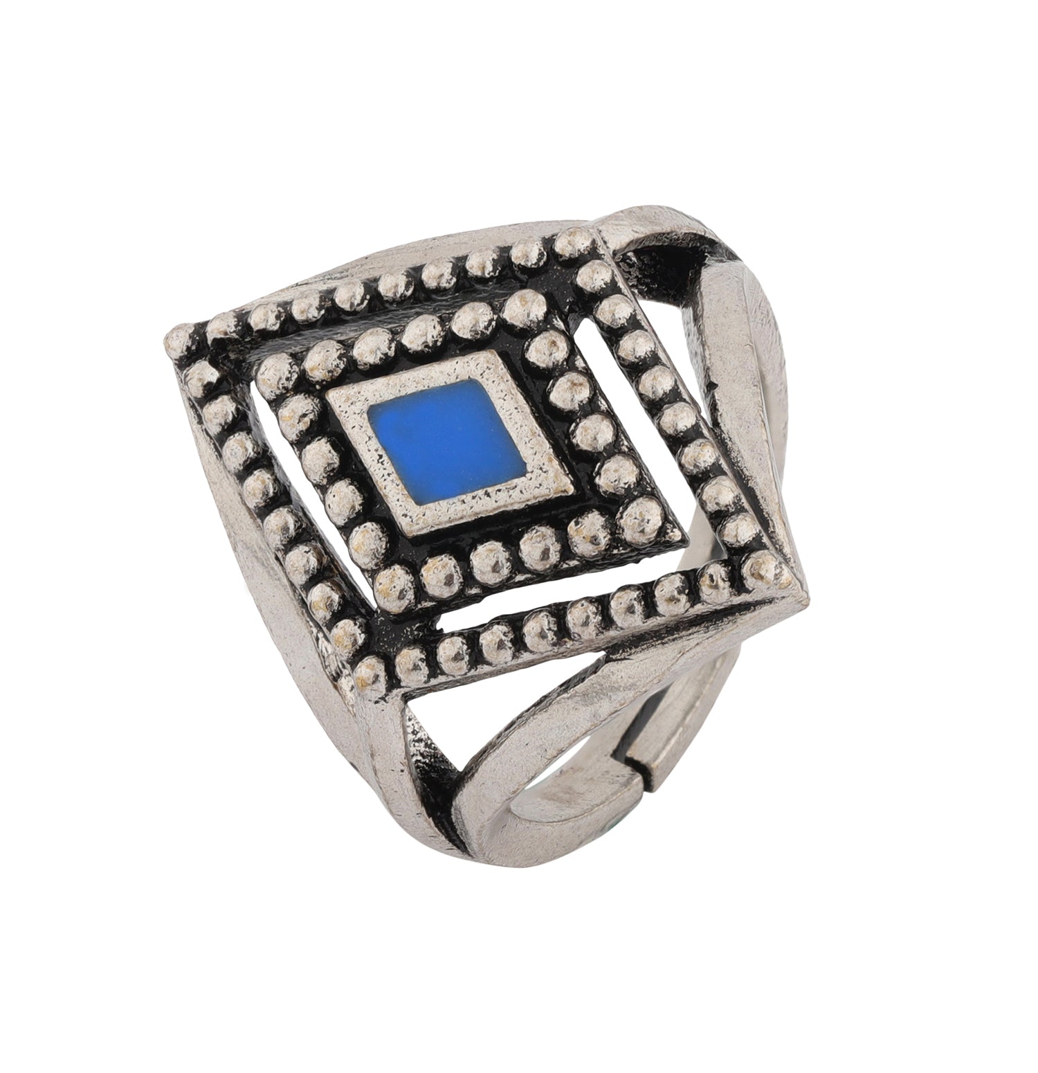 The Boho Tribe Gypsy Oxidised Ring is an exquisite piece crafted from high-quality brass and adorned with a silver oxidised plating, giving it a distinct vintage charm. This stunning ring features an intricate design with a central blue stone set within a double-layered diamond-shaped frame, beautifully embellished with delicate beadwork. Perfect for everyday wear, vacation adventures, or special occasions, this ring seamlessly blends traditional and contemporary styles, making it a versatile addition to any jewelry collection. Pair it with casual jeans and blouses or flowing maxi dresses for a chic look. An ideal gift for women on occasions like Valentine's Day, Diwali, Rakshabandhan, Christmas, New Year, and more, this ring is sure to delight mothers, sisters, girlfriends, wives, and friends alike. Embrace the free-spirited essence of boho jewelry with this timeless accessory that adds a touch of tribal elegance to any outfit.