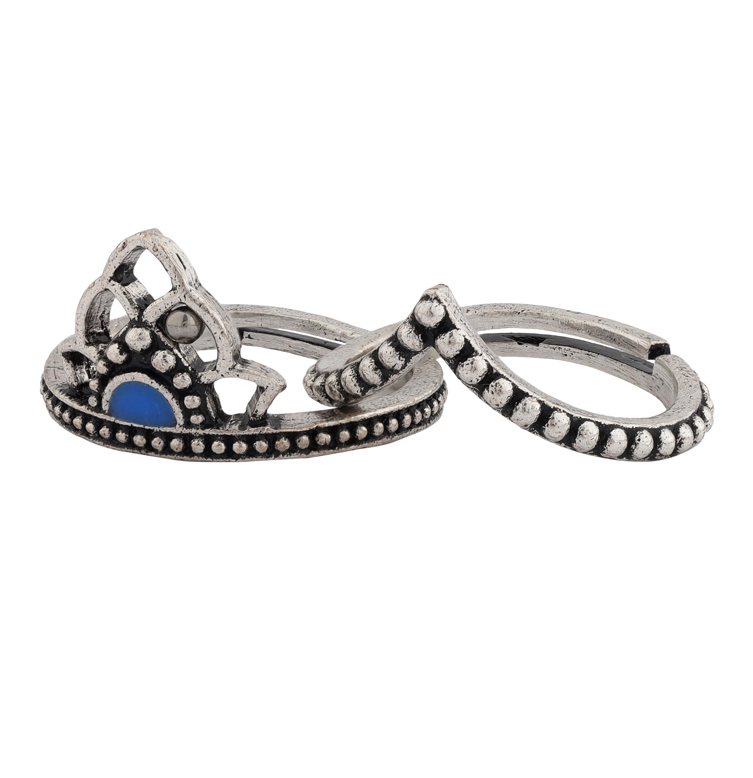 The Boho Tribe Mystic Flora Oxidised Stackable Rings are a stunning addition to any jewelry collection. Crafted from high-quality brass and plated with a silver oxidised finish, these rings feature intricate floral designs that exude a bohemian charm. The detailed craftsmanship includes a beautiful blue stone accent, adding a pop of color to the oxidised silver. Perfect for everyday wear or special occasions, these rings can be styled individually or stacked together for a chic, layered look. Ideal as a thoughtful gift for women, whether for Valentine's Day, Diwali, Rakshabandhan, or Christmas, these rings are versatile and stylish. They make a great gift for sisters, girlfriends, wives, mothers, or any special woman in your life. Embrace the free-spirited, tribal essence of boho jewelry with these statement rings that are perfect for vacation wear, office jewelry, or any casual outing.