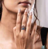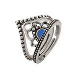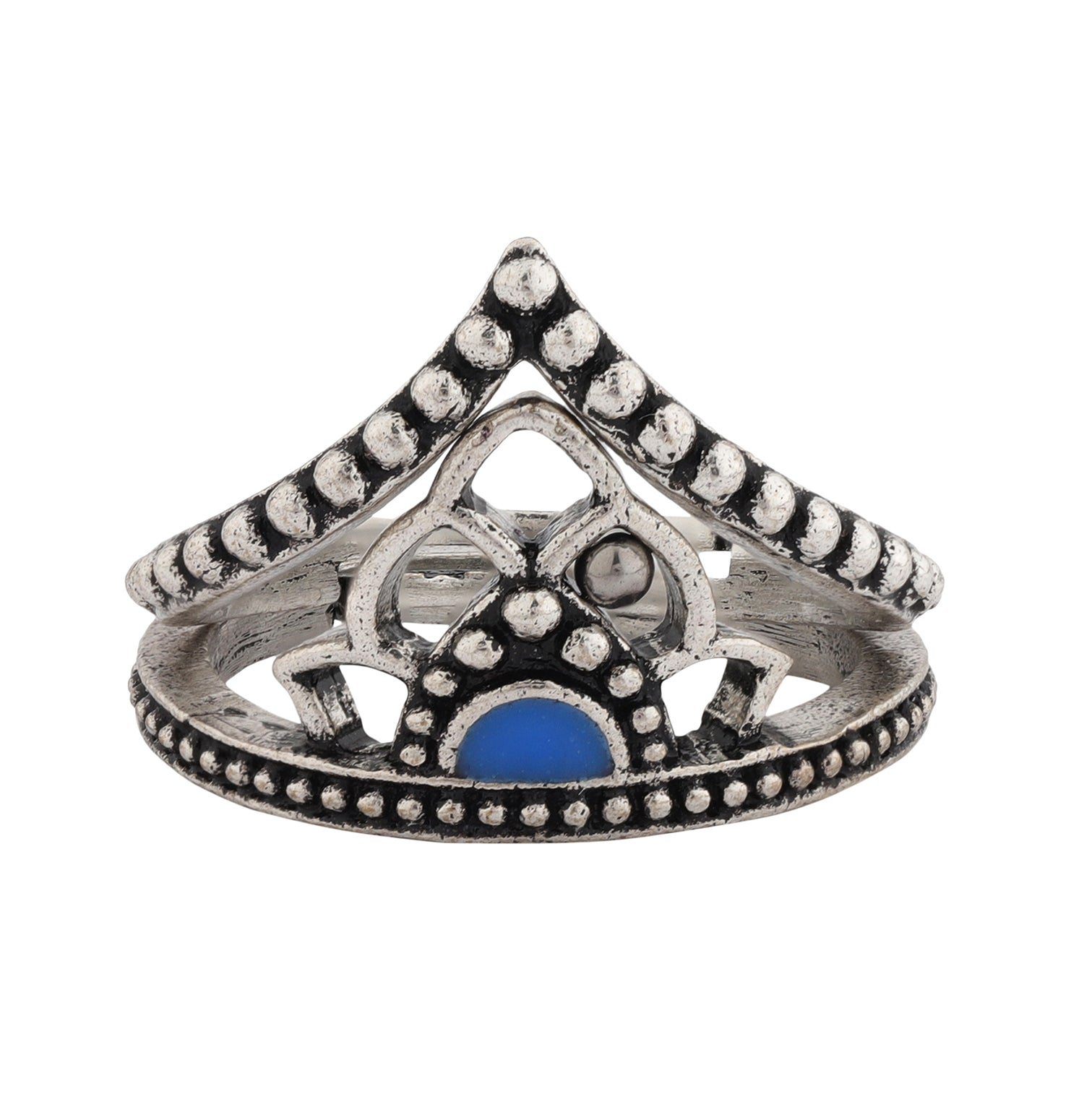 The Boho Tribe Gypsy Oxidised Ring is an exquisite piece crafted from high-quality brass and adorned with a silver oxidised plating, giving it a distinct vintage charm. This stunning ring features an intricate design with a central blue stone set...