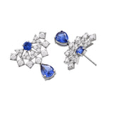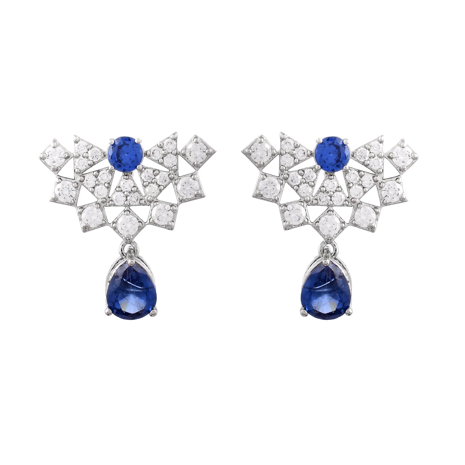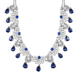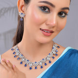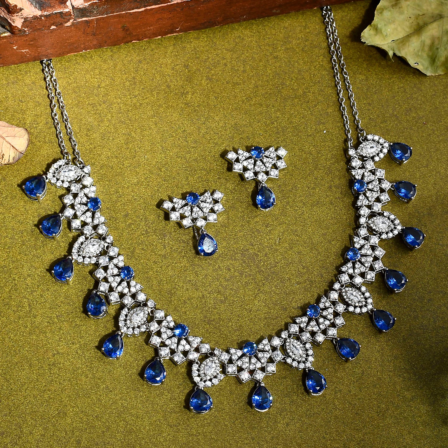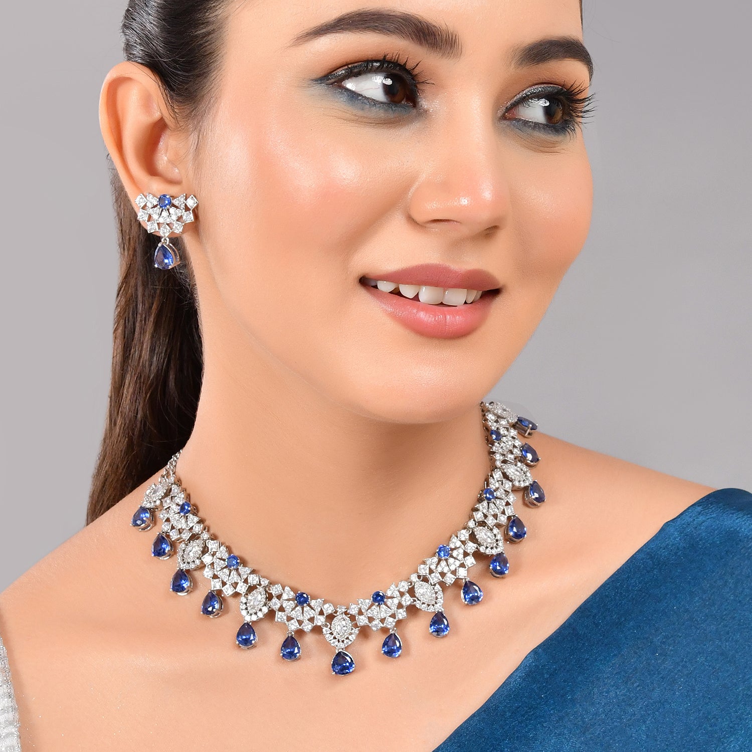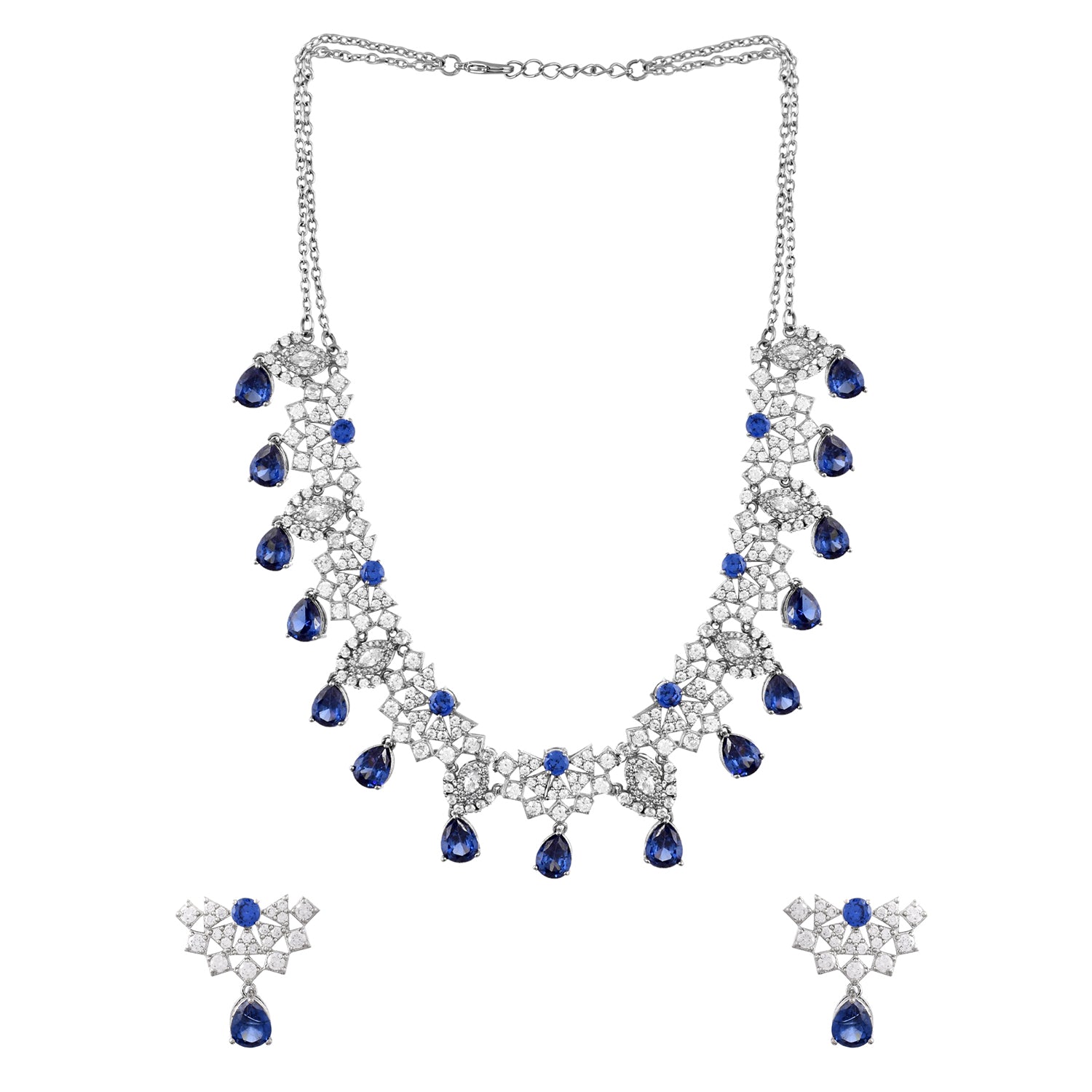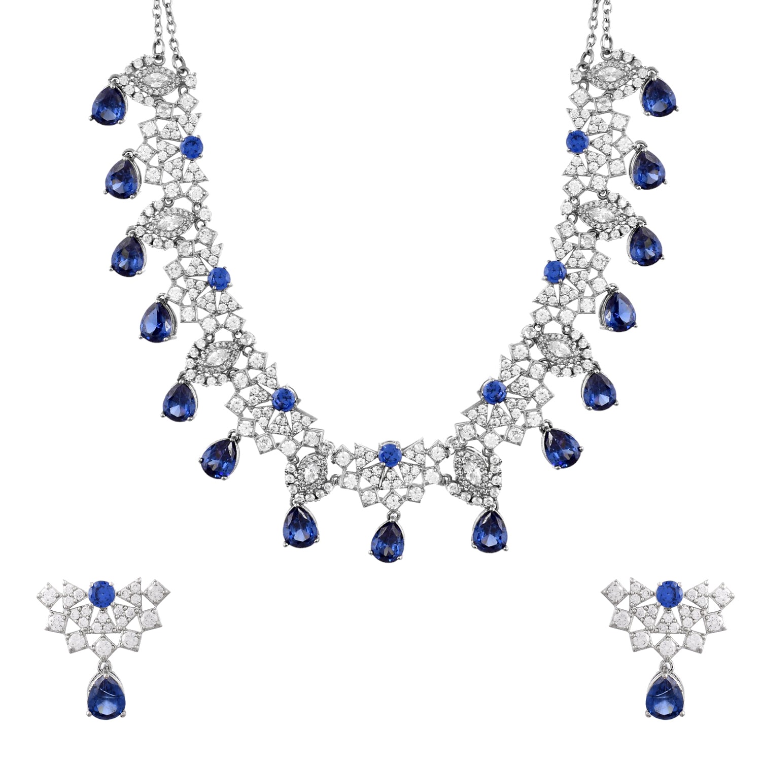 Inspired by the morning dew and the beauty of dawn, this lovely jewellery set has been fashioned out of brass. Teardrop cut purple and white zirconia gems adorn the silver plated necklace and earrings. Pair with a formal gown.