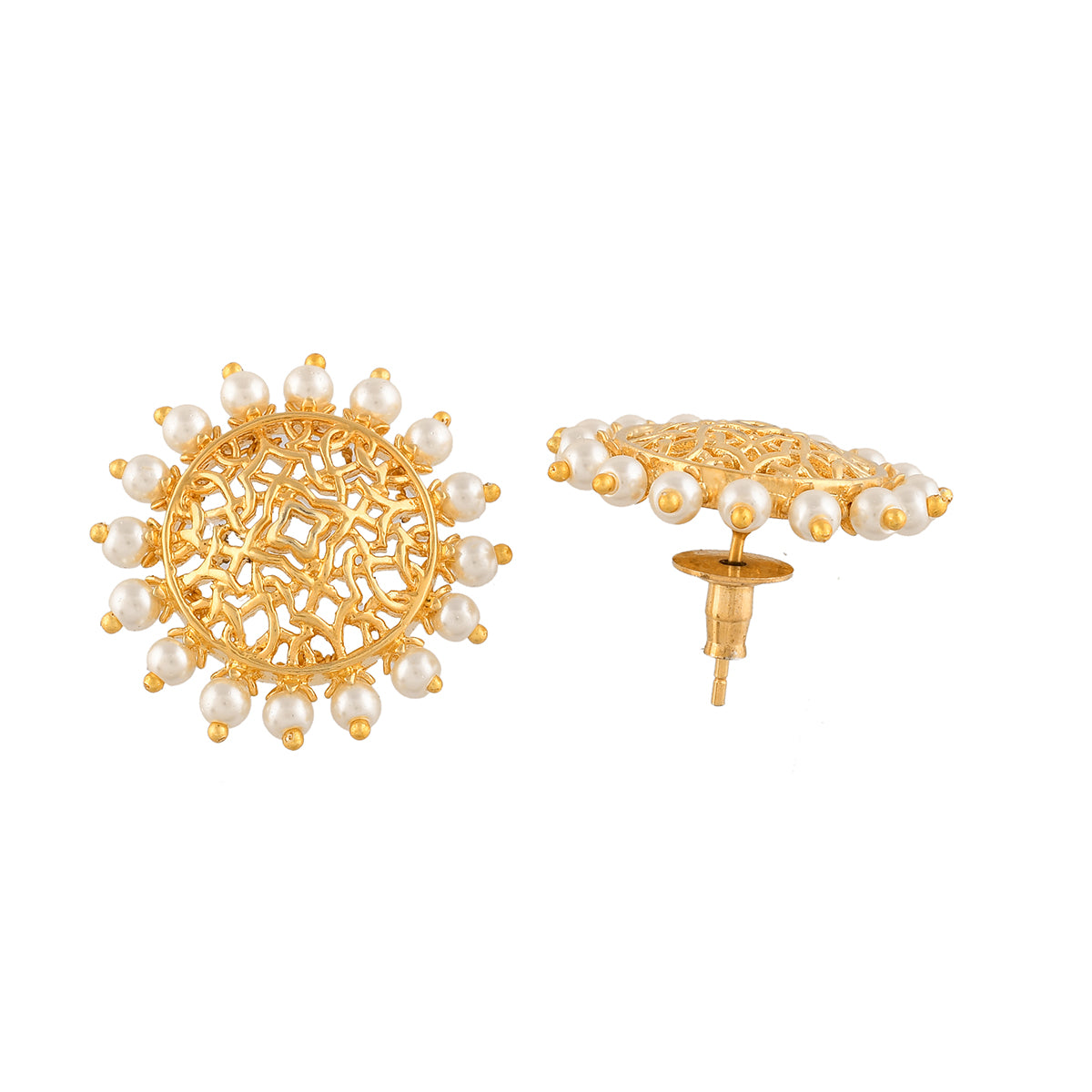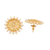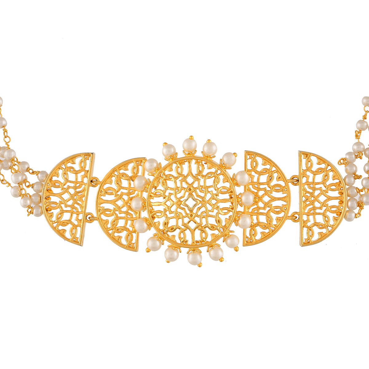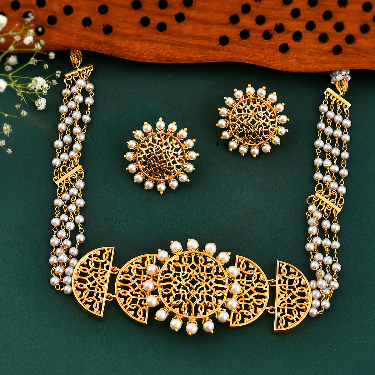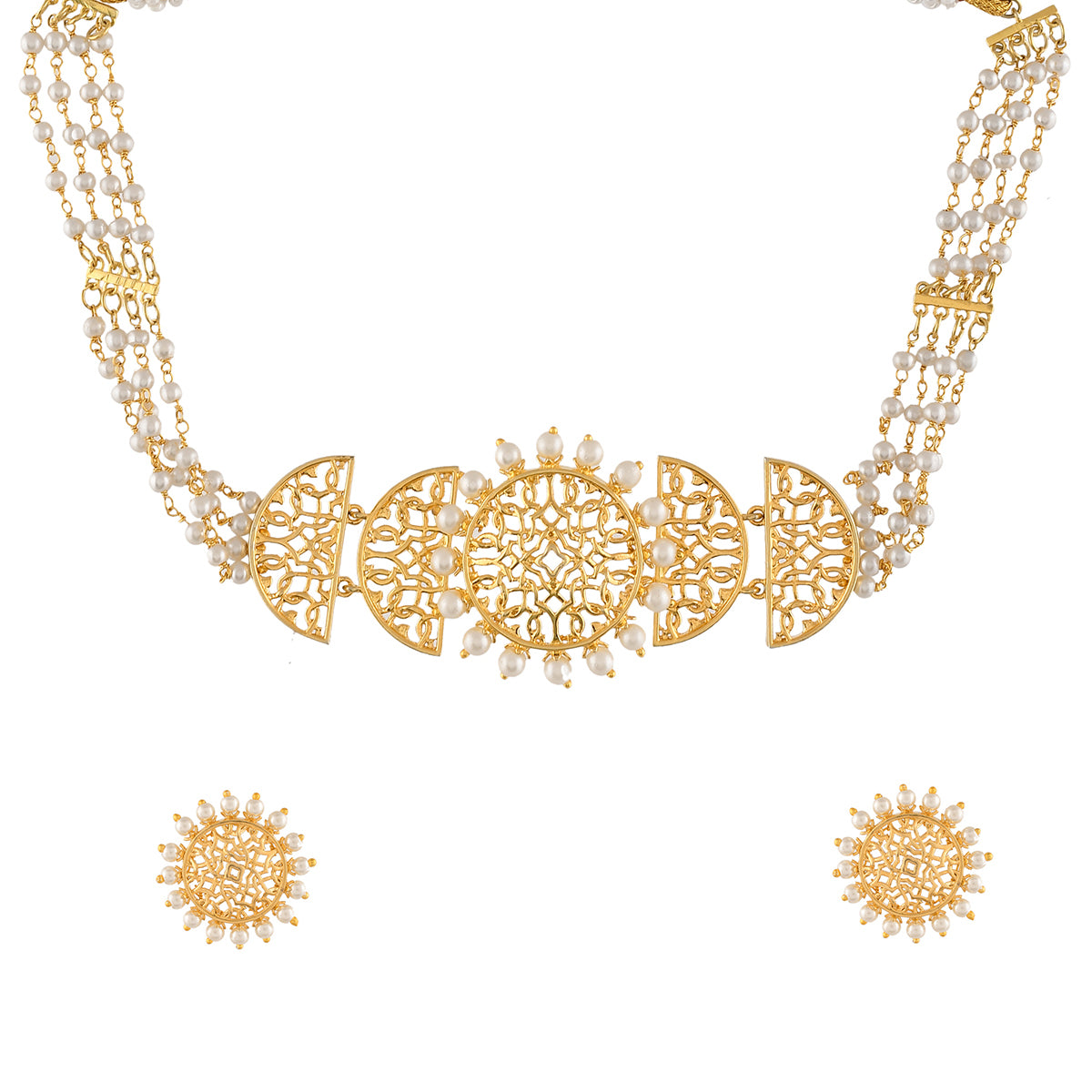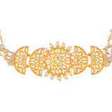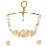 The Zara Choker Set An Architectural Masterpiece of Opulence and Elegance features a striking design, boasting a sizable round cutwork statement motif, lavishly gold-plated and paired with exquisite round studs earrings, creating a jewelry piece that radiates opulence and charm. Its design seamlessly marries tradition with contemporary aesthetics, ensuring it stands as a versatile addition to your jewelry collection