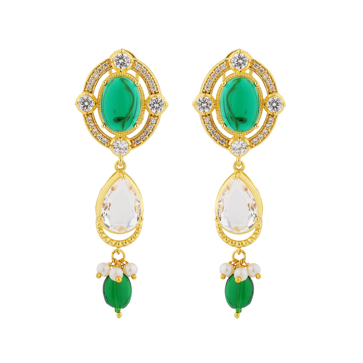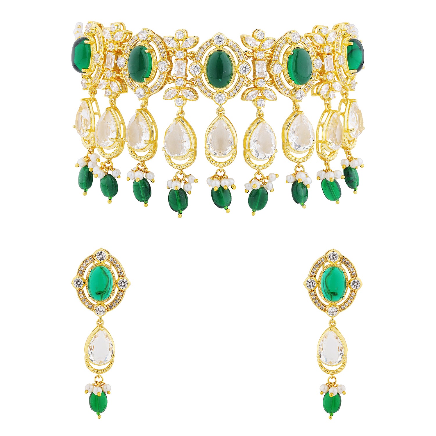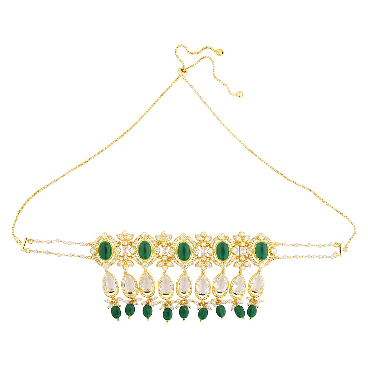 The Queens of Rajasthan Mezari Choker Necklace Set is an elegant celebration of royal grace, inspired by the refined jewellery worn by queens during palace ceremonies and festive gatherings. A part of the timeless Queens of Rajasthan collection, this choker set blends traditional Rajputi craftsmanship with a fresh, feminine charm, perfect for women who appreciate heritage with a modern touch. Expertly crafted in premium brass and finished with radiant yellow gold plating, the Mezari set features intricate Kundan work highlighted by deep green stones, soft ivory crystal drops, and delicate pearl accents. The choker-style necklace drapes beautifully along the neckline, while the matching earrings mirror the same graceful detailing, creating a harmonious and regal look. Inspired by Rajasthan’s iconic kings and queens, this choker necklace set is designed for modern brides and women who want jewellery that feels meaningful, rooted in tradition yet effortless to wear. Whether styled as bridal jewellery, worn for festive occasions, or chosen as a thoughtful gift for bride or bridesmaid, the Mezari Choker Necklace Set adds a timeless royal glow to every celebration.