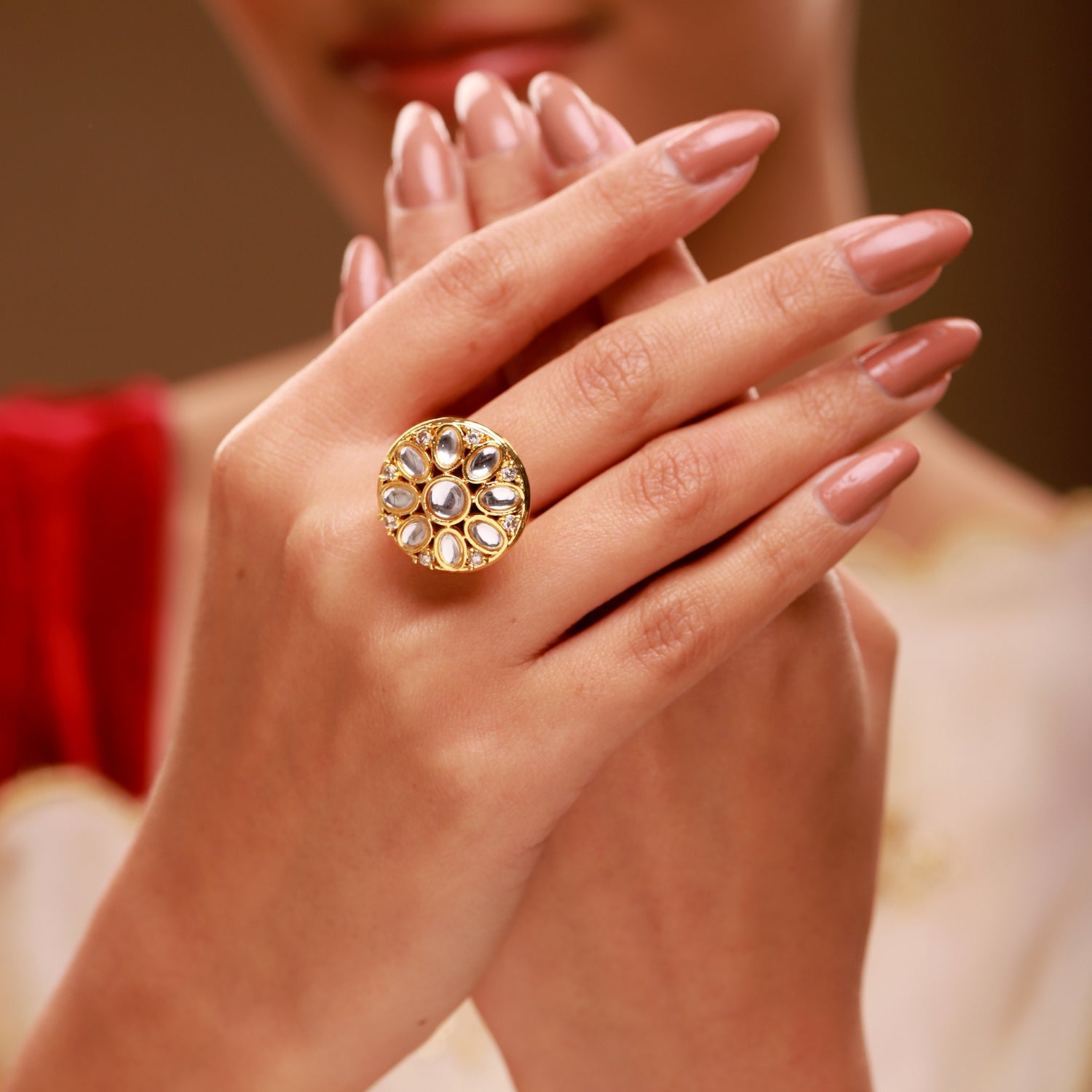 Softly radiant and royally timeless, the Queens of Rajasthan Noora Statement Ring is inspired by the gentle glow of palace jewels worn by the queens of Rajasthan. A part of the iconic Queens of Rajasthan collection, this ring celebrates heritage craftsmanship with a design that feels elegant, balanced, and beautifully wearable for modern women. Crafted in premium brass and finished with rich yellow gold plating, the Noora Statement Ring features a floral-inspired kundan arrangement with luminous white stones set in a harmonious circular silhouette. The design reflects classic Rajputi artistry while maintaining a refined softness, making it perfect for brides, bridesmaids, and women who love traditional jewellery with understated grandeur. Designed with comfort in mind, this adjustable ring for women ensures a secure and easy fit, allowing you to wear it effortlessly through weddings, festive gatherings, and celebrations. Whether styled as a bridal ring, paired with traditional attire, or worn as a statement finger ring for women, Noora adds a graceful royal touch to every look.