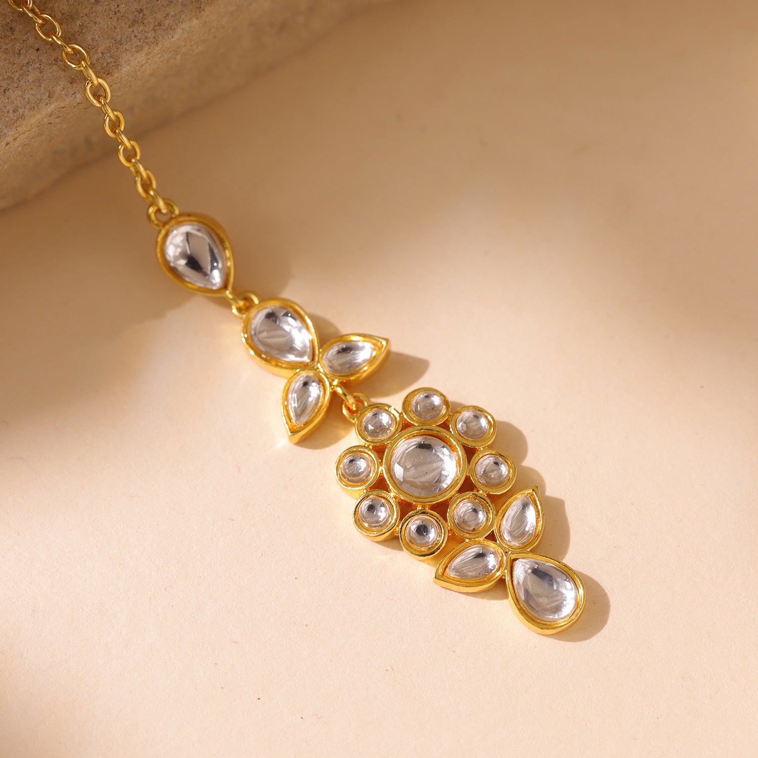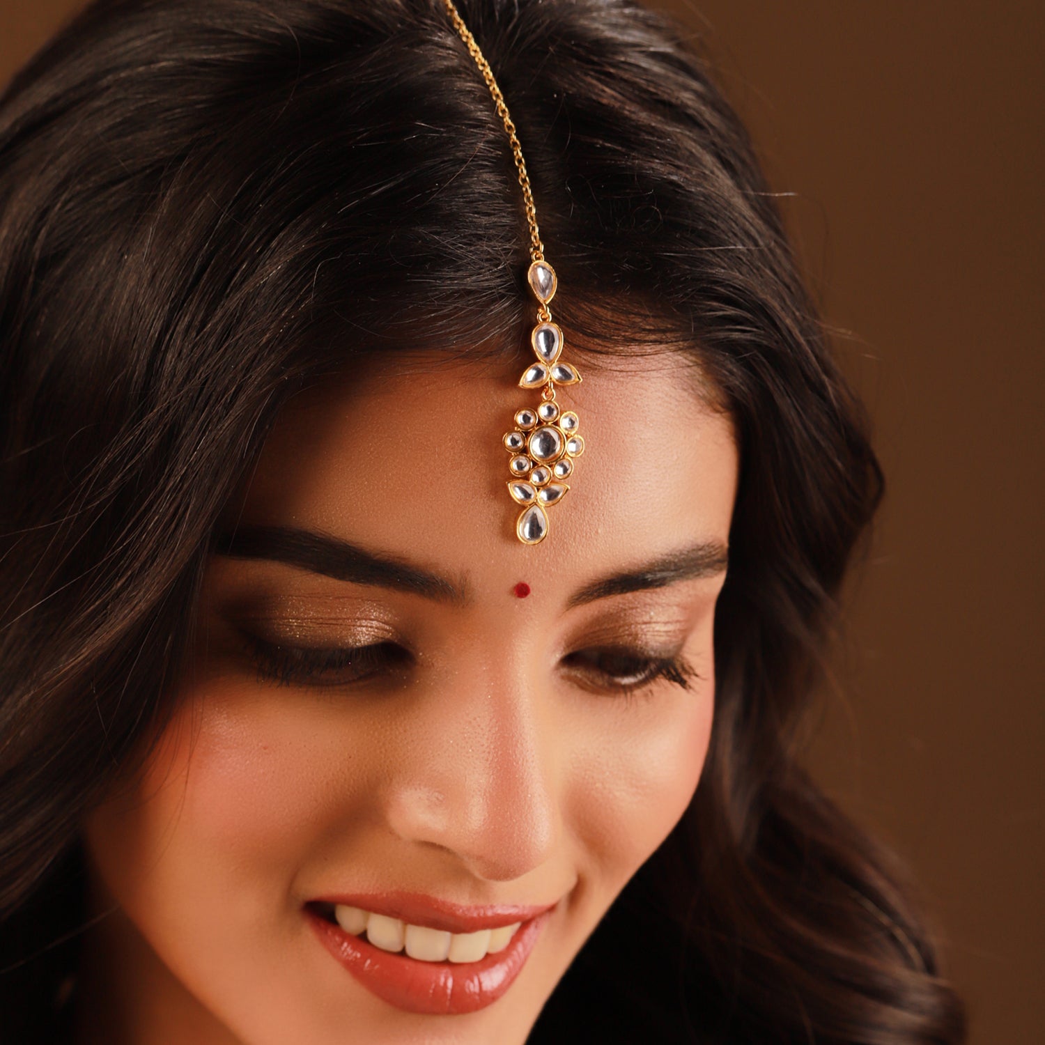 Graceful, elegant, and rooted in royal tradition, the Queens of Rajasthan Veeraya Maang Tikka is a timeless piece inspired by the jewellery worn by Rajput queens during ceremonial celebrations. Part of the majestic Queens of Rajasthan collection, this maang tikka is designed for women who love heritage jewellery that feels meaningful, refined, and easy to wear. Crafted in premium brass and finished with radiant yellow gold plating, the Veeraya Maang Tikka features luminous stone detailing arranged in a classic vertical silhouette. The delicate chain flows into a beautifully crafted centre motif, making it a perfect maang tikka for women traditional while remaining lightweight and comfortable for long occasions. Ideal as a bridal mangtika, this piece adds a subtle yet regal touch to bridal lehengas, sarees, and festive outfits. It also works beautifully for bridesmaids and women attending weddings or cultural celebrations, offering a balance of tradition and modern elegance.