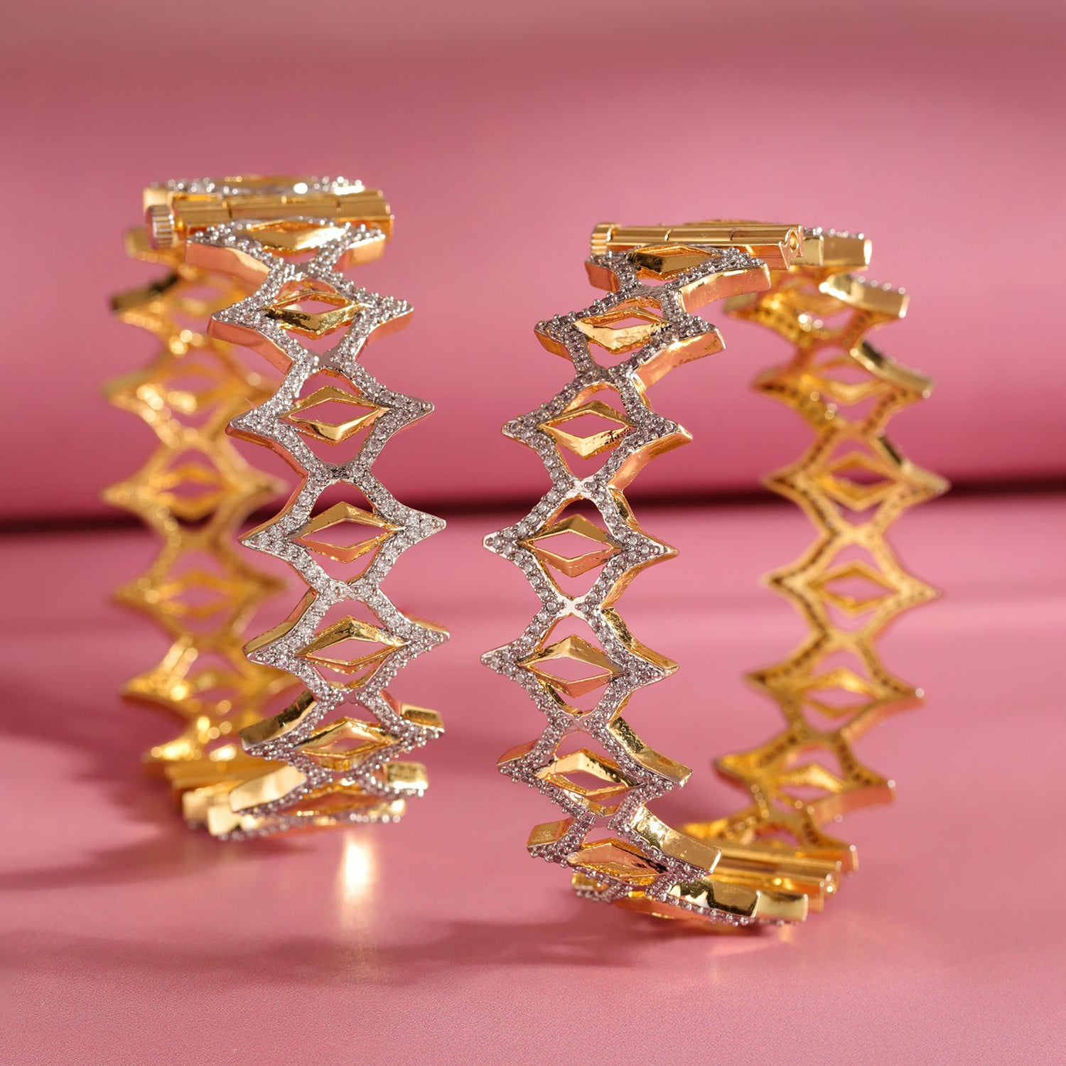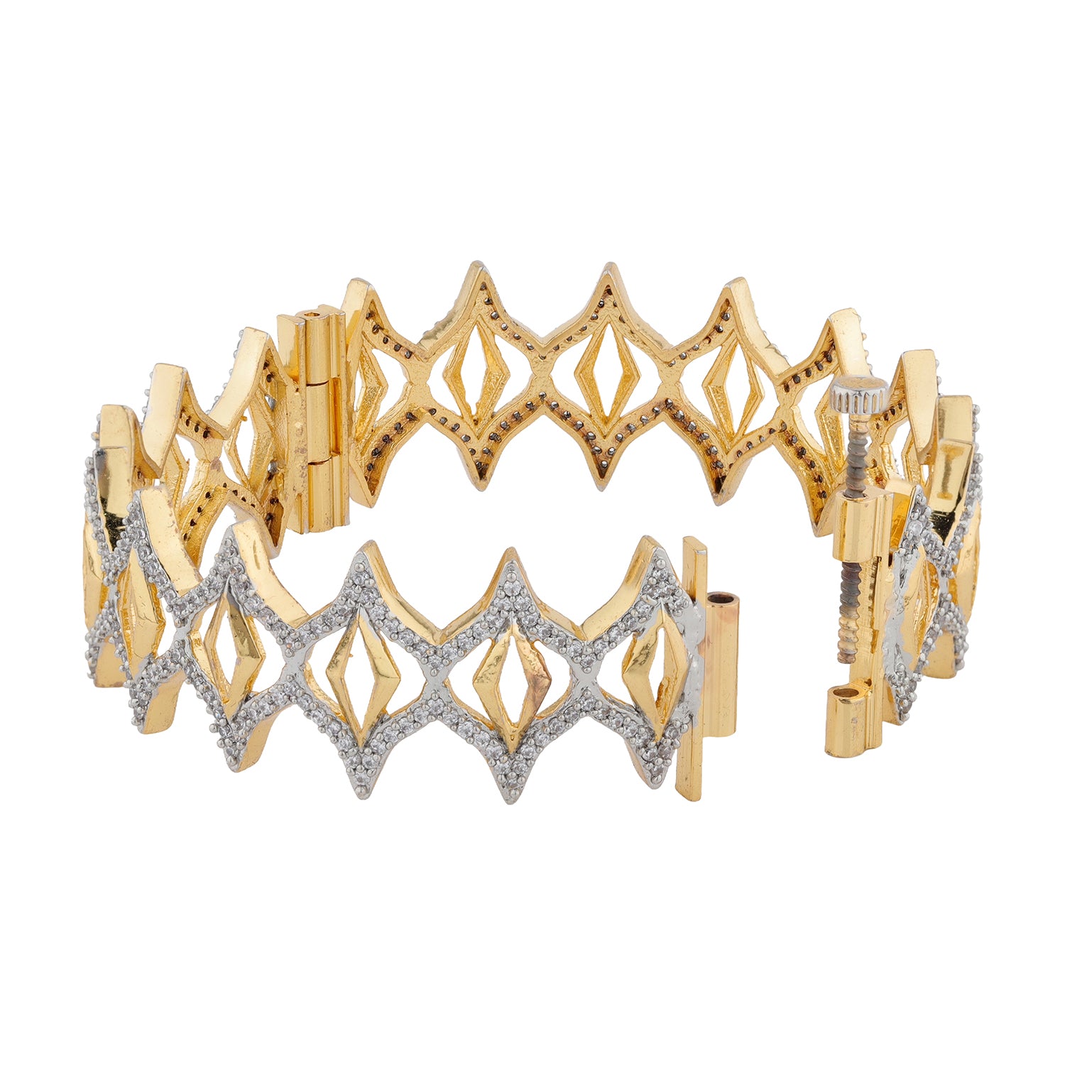 The Shahi Dwar Ruhani Hinge Bangle is a breathtaking blend of timeless tradition and refined artistry. Drawing inspiration from the grand arches of Jaipur’s royal palaces, this designer bracelet for women captures the spirit of architectural beauty and regal grace. The intricate openwork design mirrors the delicate symmetry and rhythm of palace gateways, each curve telling a story of elegance and strength. Crafted from high-quality brass and finished with rich yellow gold plating, the bangle shines with CZ American diamonds, adding a touch of ethereal sparkle. Light yet luxurious, it’s a versatile piece perfect for both grand celebrations and intimate gatherings. Whether you’re dressing up for a wedding or gifting someone special, this women American diamond bracelet is a timeless expression of love and sophistication.