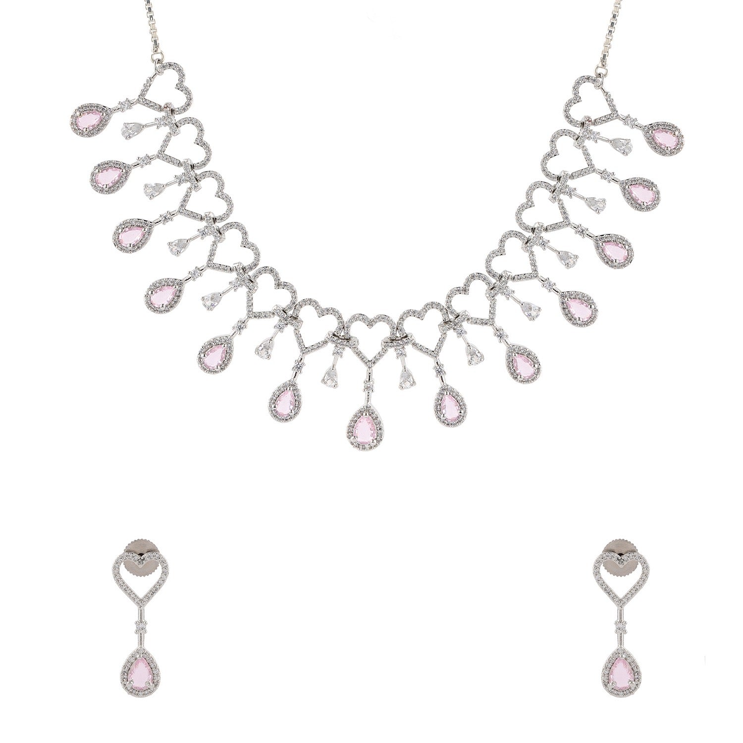 Celebrate elegance with the Halo Essence Heart Collar Necklace Set, a dazzling fusion of craftsmanship, sentiment, and style. Designed in radiant white rhodium over premium brass, this set showcases a heart-shaped centerpiece surrounded by a halo of shimmering American diamonds (CZ), echoing the iconic halo diamond setting adored by royalty and fashion icons alike. The necklace’s collar silhouette adds a regal touch, while the matching earrings complete the look with effortless grace. Whether paired with a silk saree, a fusion kurta, or a sleek cocktail dress, this set elevates any ensemble with its luminous charm. Perfect for weddings, parties, or everyday chic, it’s a statement piece that speaks volumes. From Valentine’s Day to Rakshabandhan, Diwali to Christmas, this is a heartfelt gift for your sister, wife, girlfriend, or mother, an heirloom-worthy treasure that blends tradition with modern sparkle.