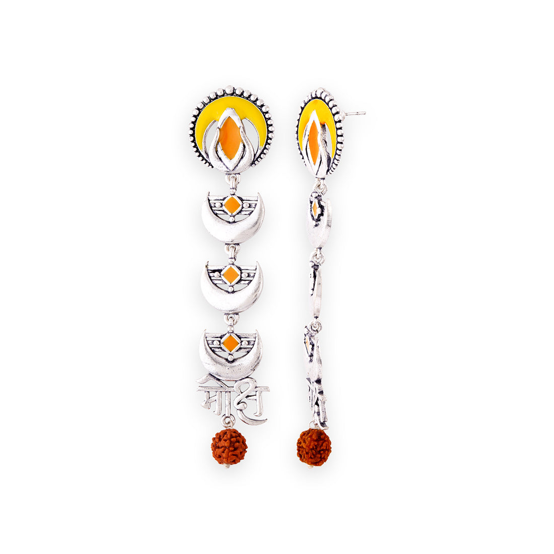 Adorned with Rudraksha beads and featuring a “Moksh” inscription, these enamelled earrings have been inspired by ancient Indian texts and Yogic principles. Made from brass and oxidised plated, the earrings can be paired with casual Indian looks.Weight (Gms): 5Size (LxW)(Inch):...