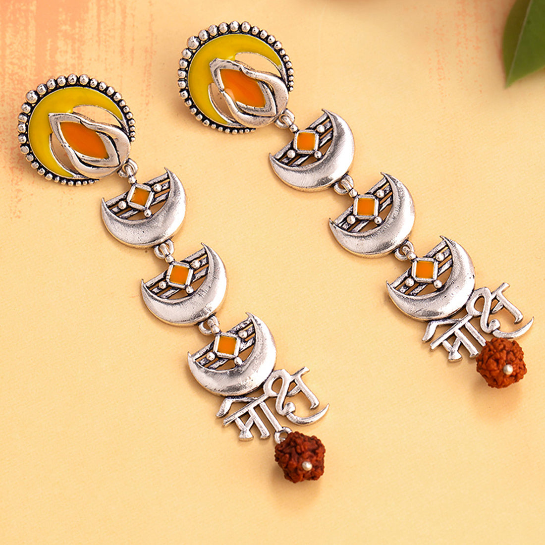 "Moksh” inscription bearing layered drop earrings, inspired by ancient Indian texts, practices and yogic principles. Adorned with Rudraksha beads and enamelled, the pair has been fashioned out of brass. Wear the oxidised plated earrings with a casual saree.