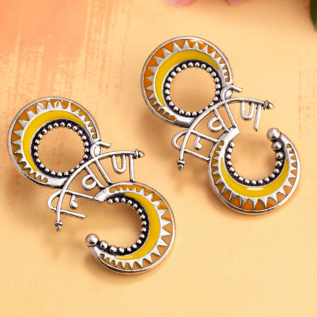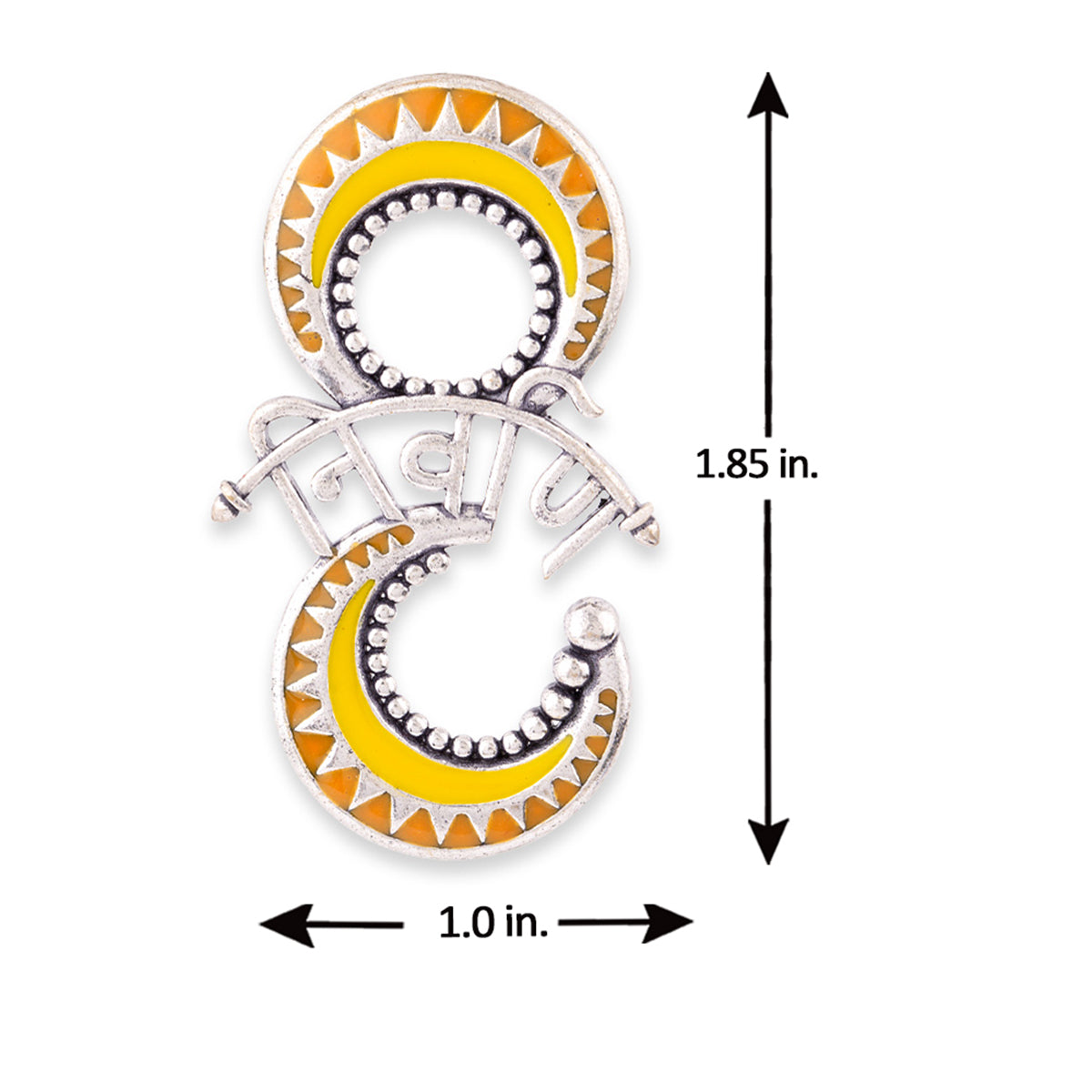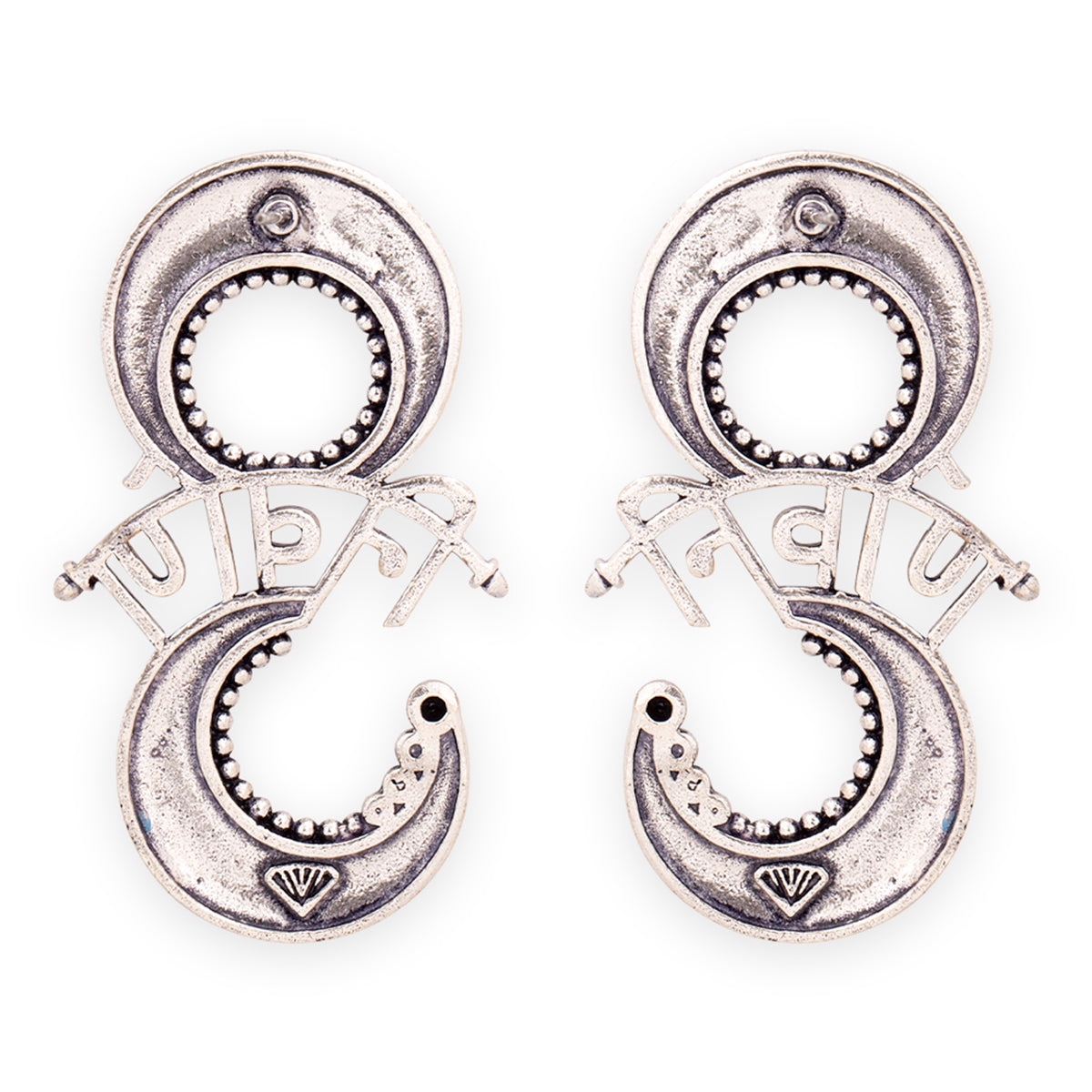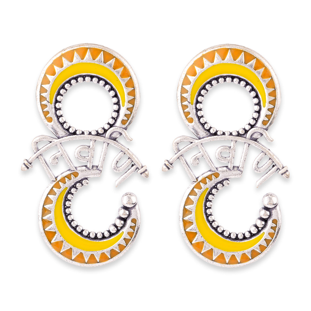Archery earrings fashioned after popular Indian mythological symbol. Made from brass and inscribed with mantra. Pair the oxidised plated earrings with a casual kurta. This piece of jewelry comes with the Voylla assurance of quality and durability. Caring for your...