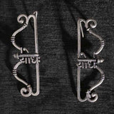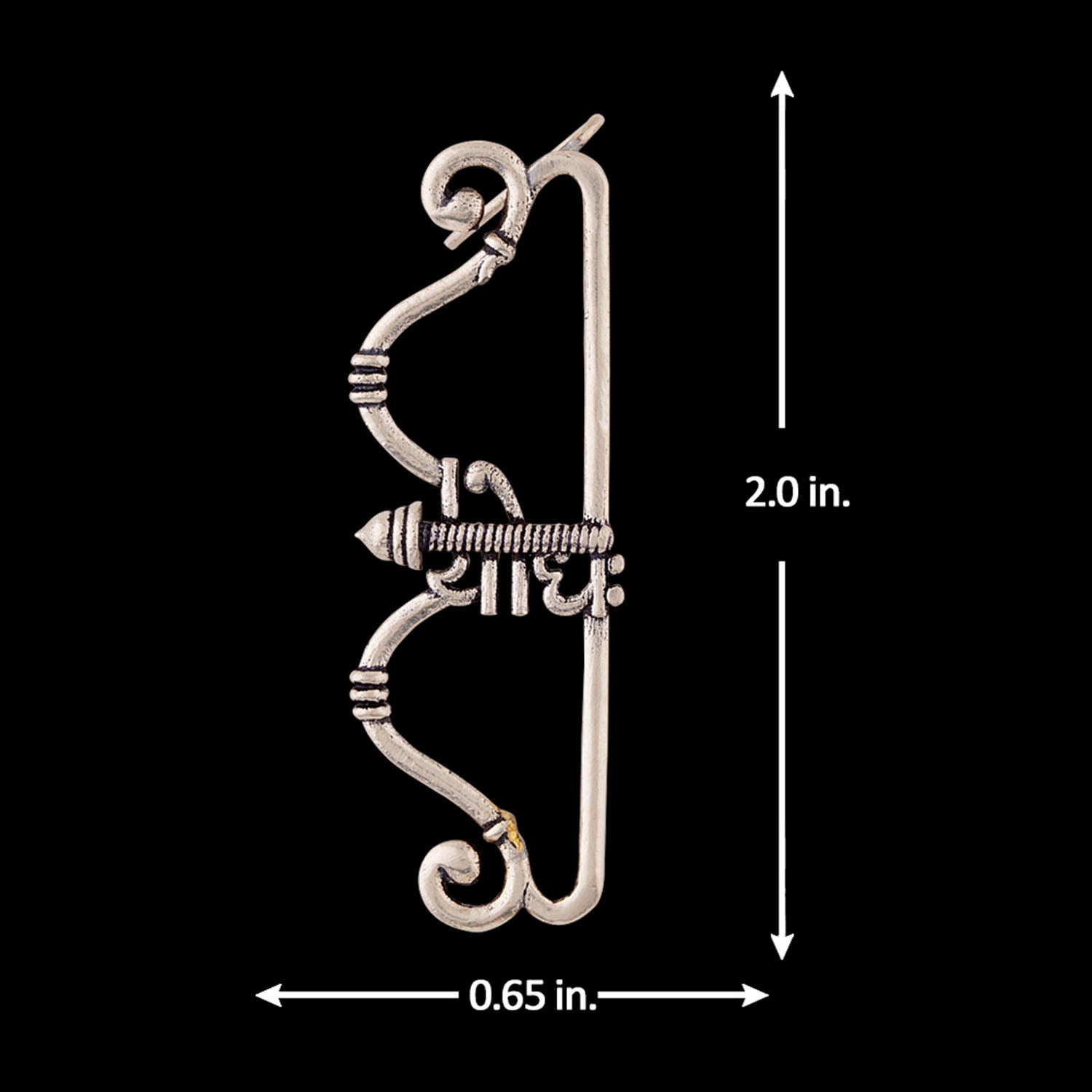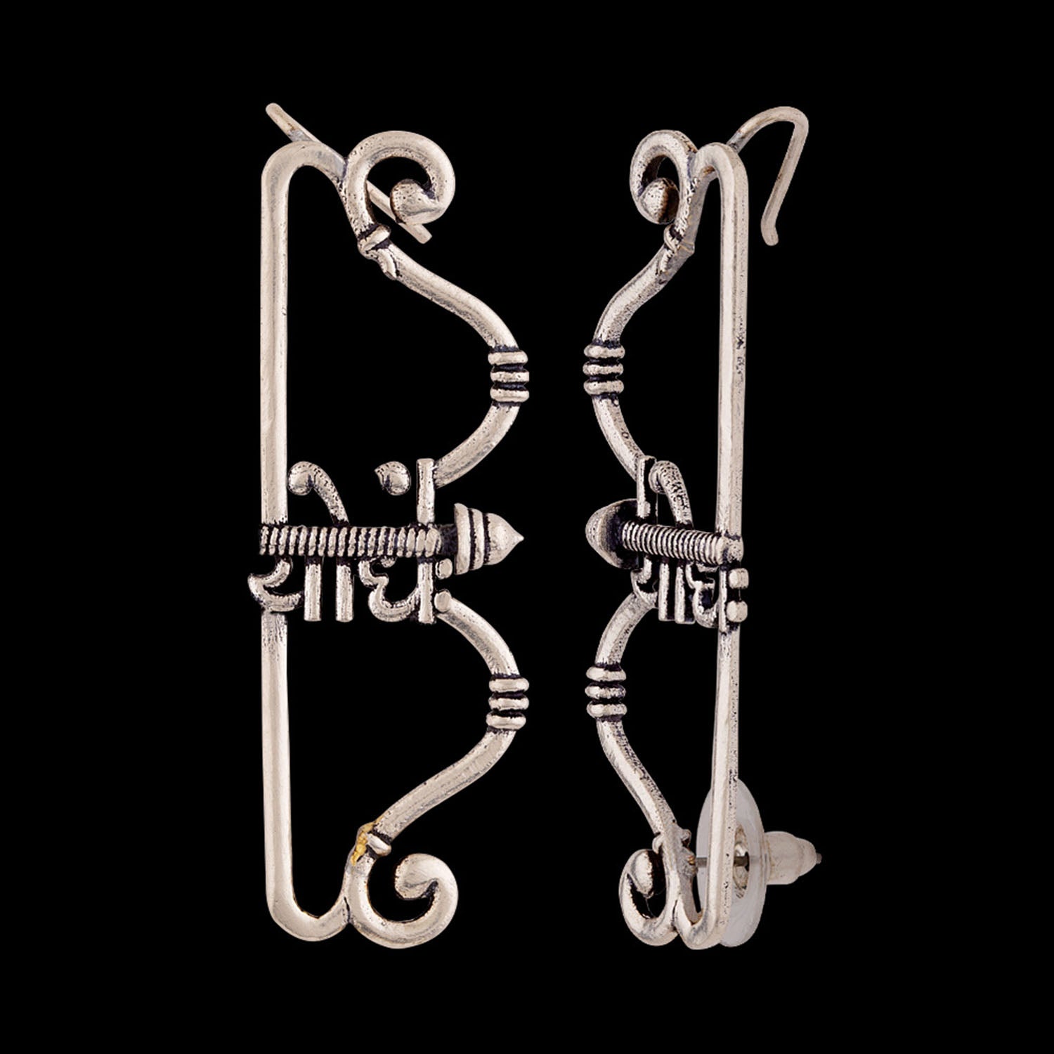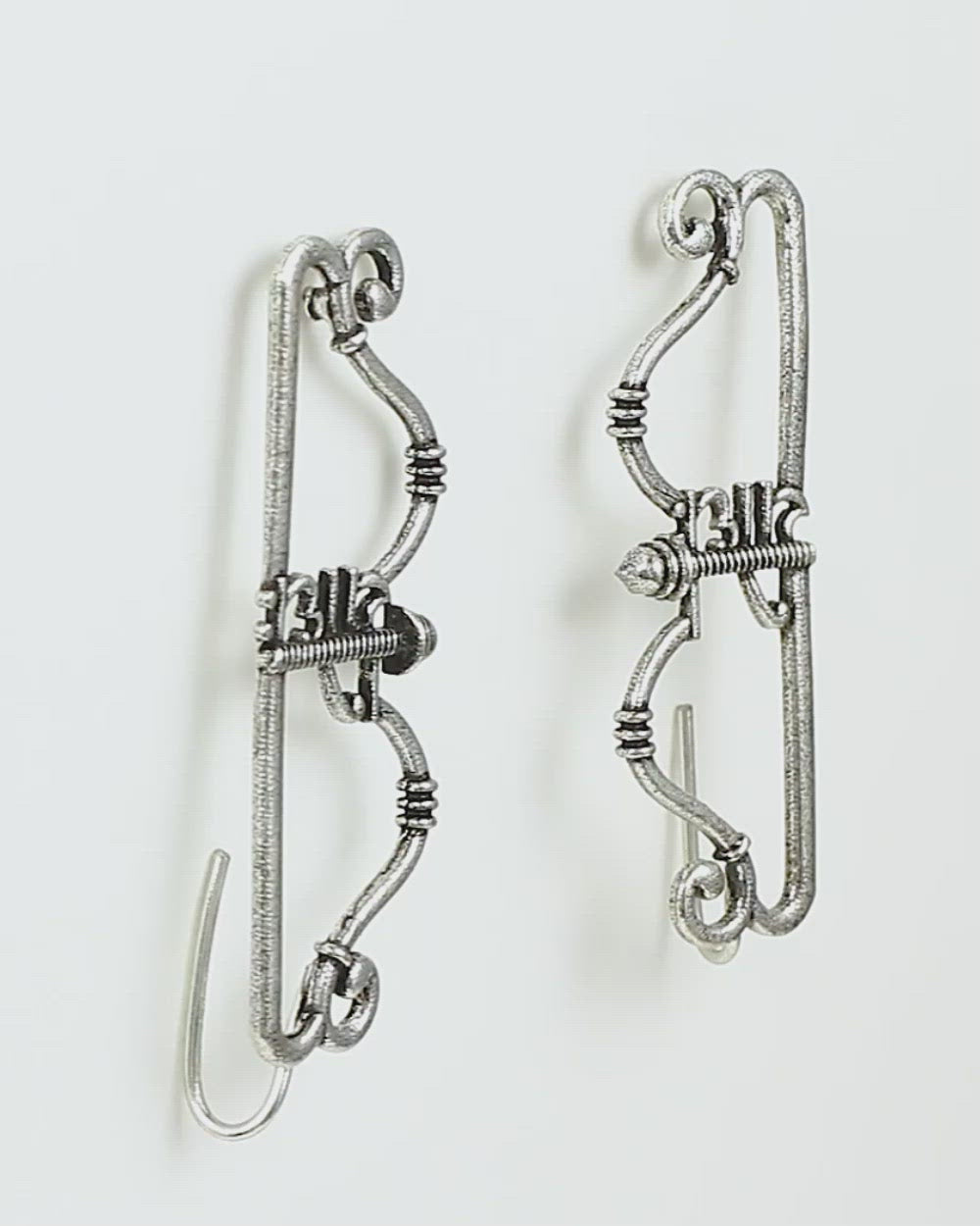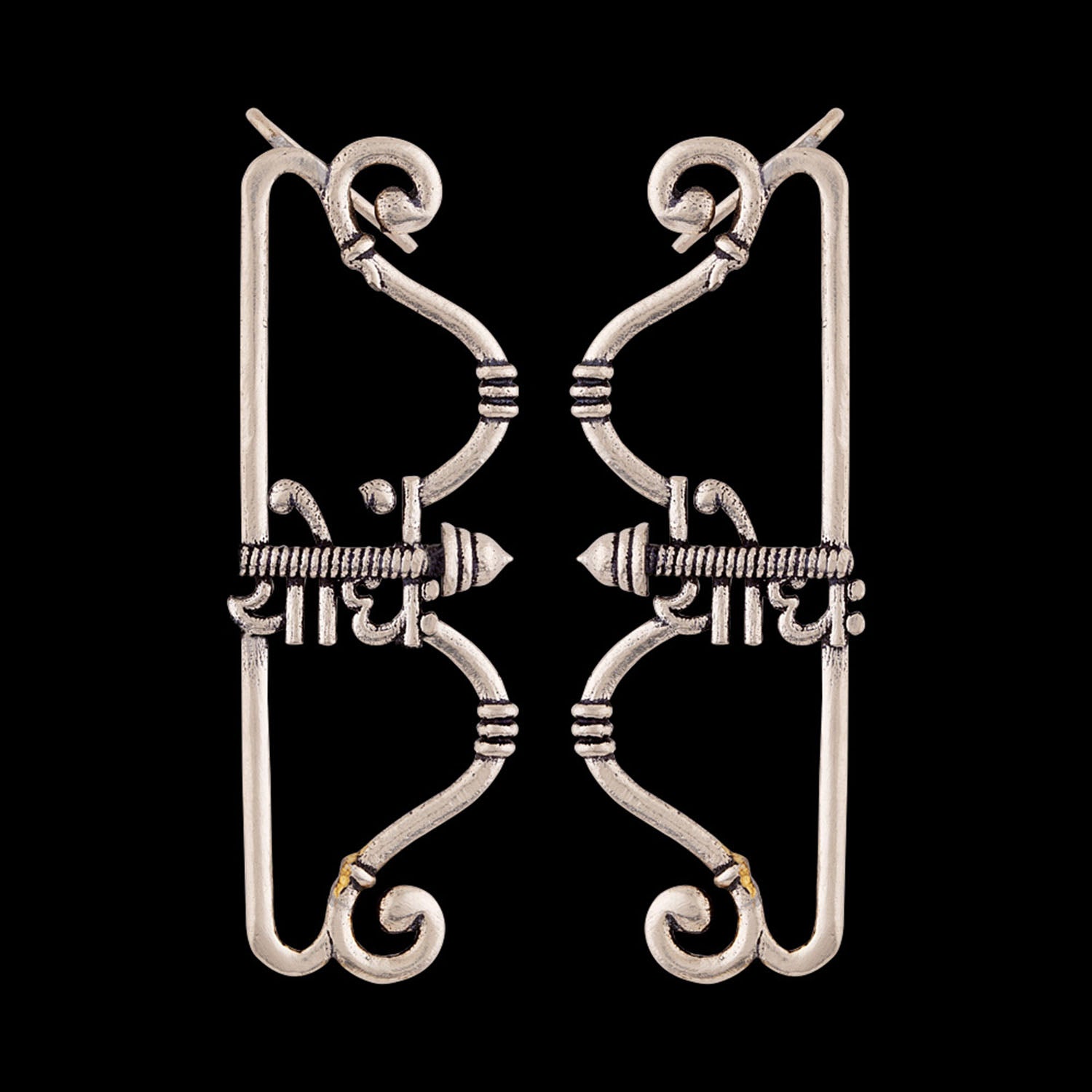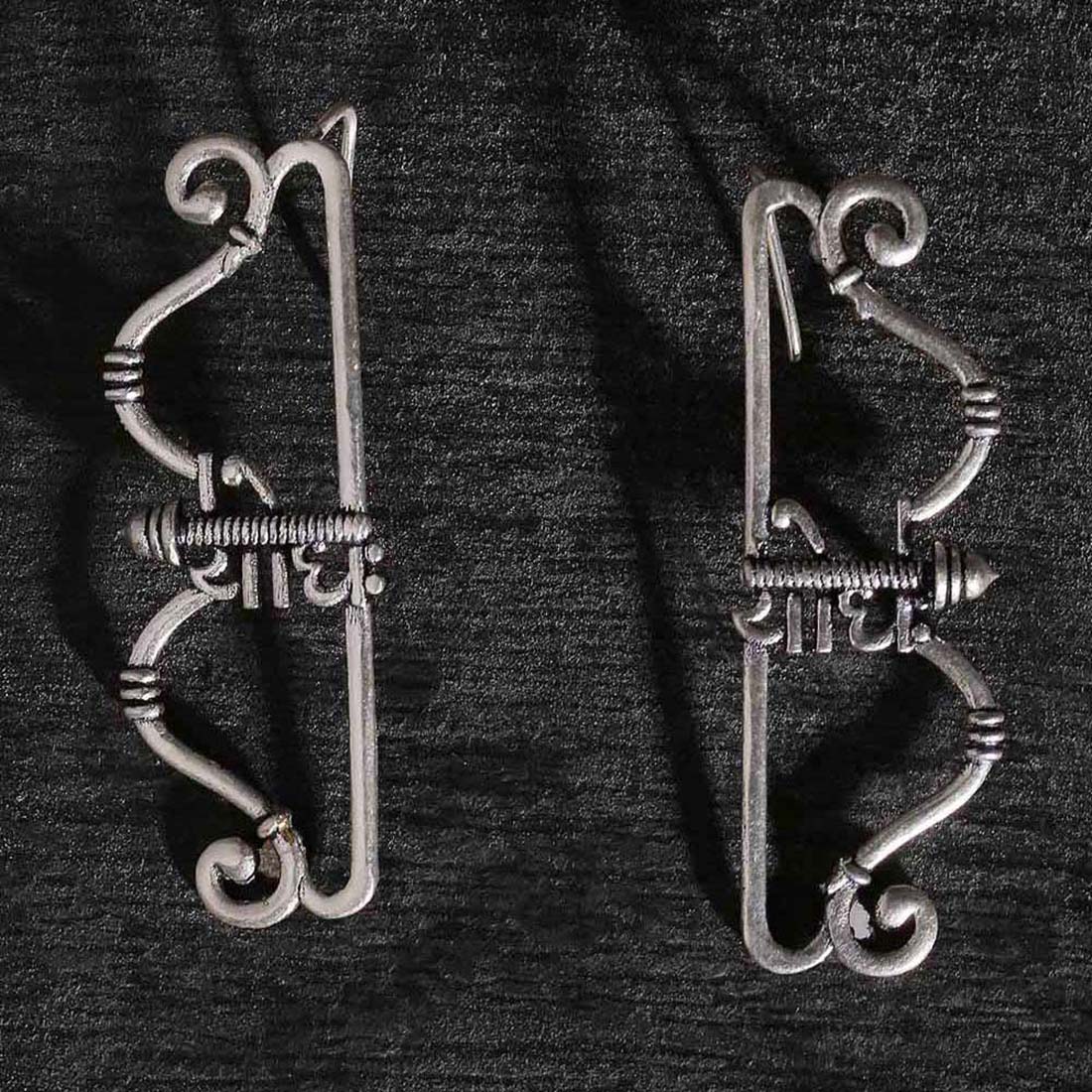 Archery earrings fashioned after popular Indian mythological symbol. Made from brass and inscribed with mantra. Pair the oxidised plated earrings with a casual kurta.