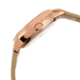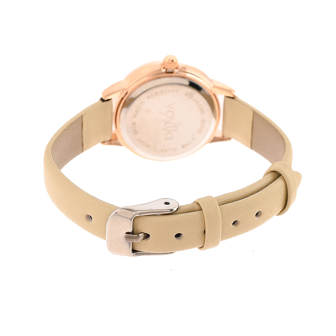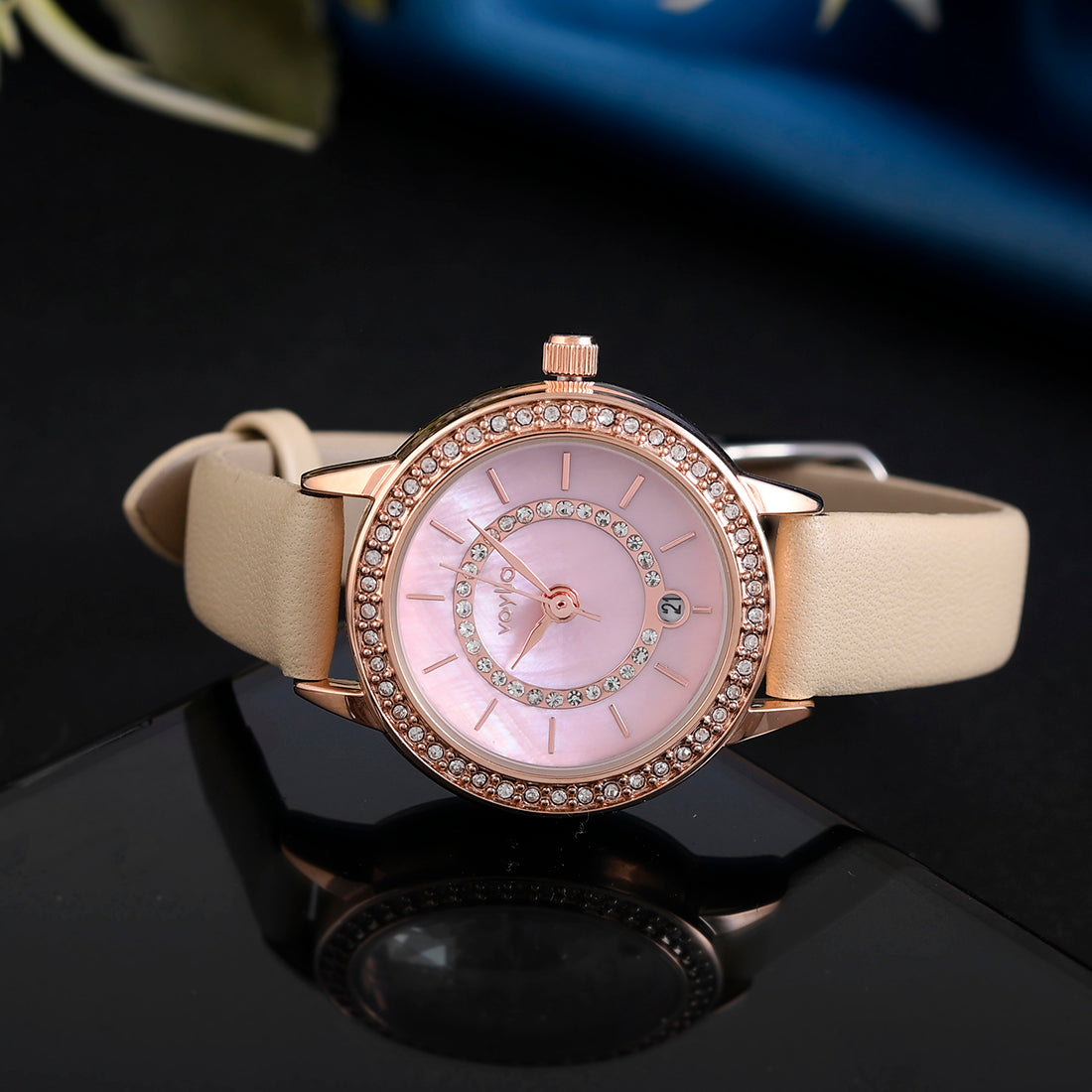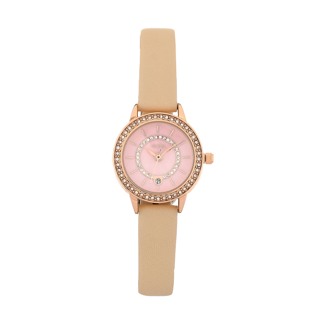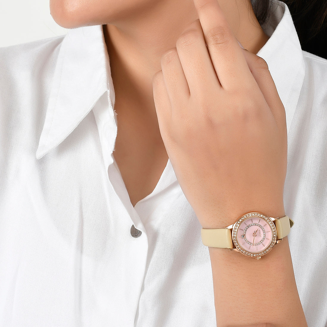 Women's analog wrist watch with a lovely pink dial and gemstones. The rose gold plated piece has been crafted from brass. A good match for formal and casual looks of all kinds.