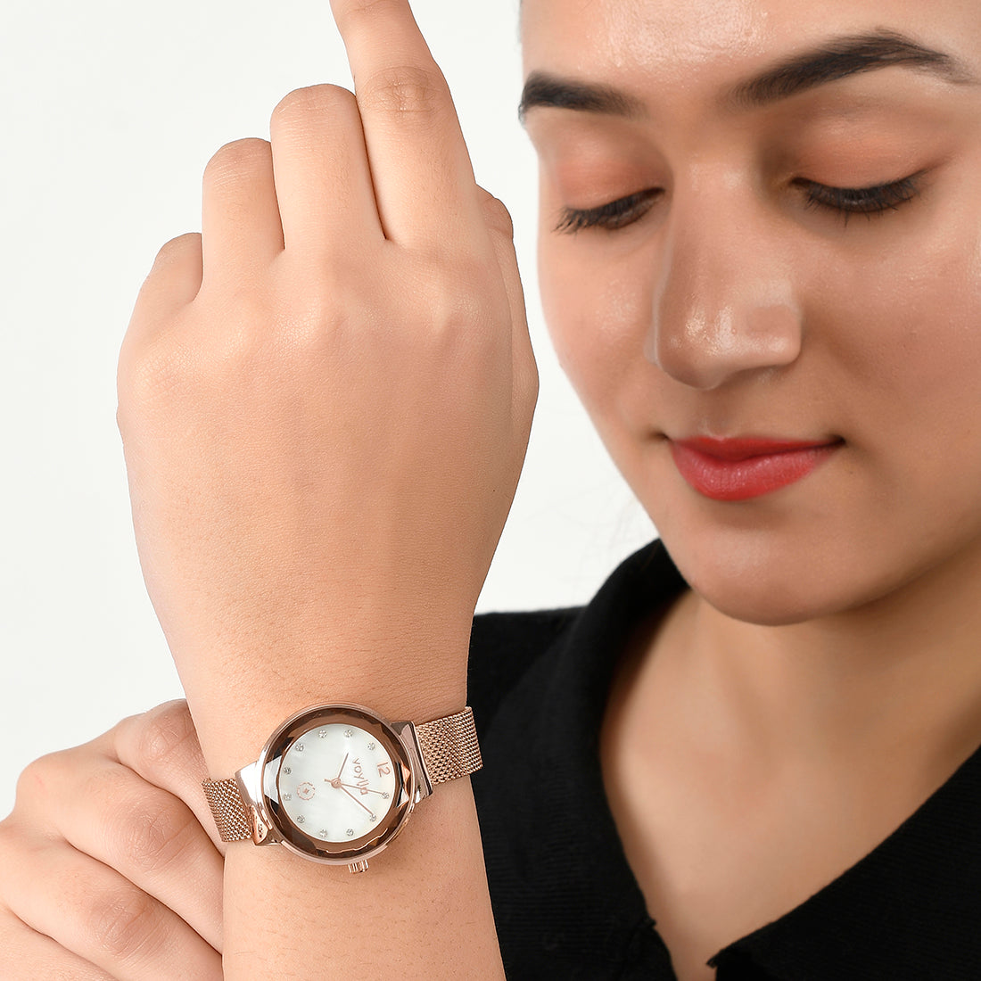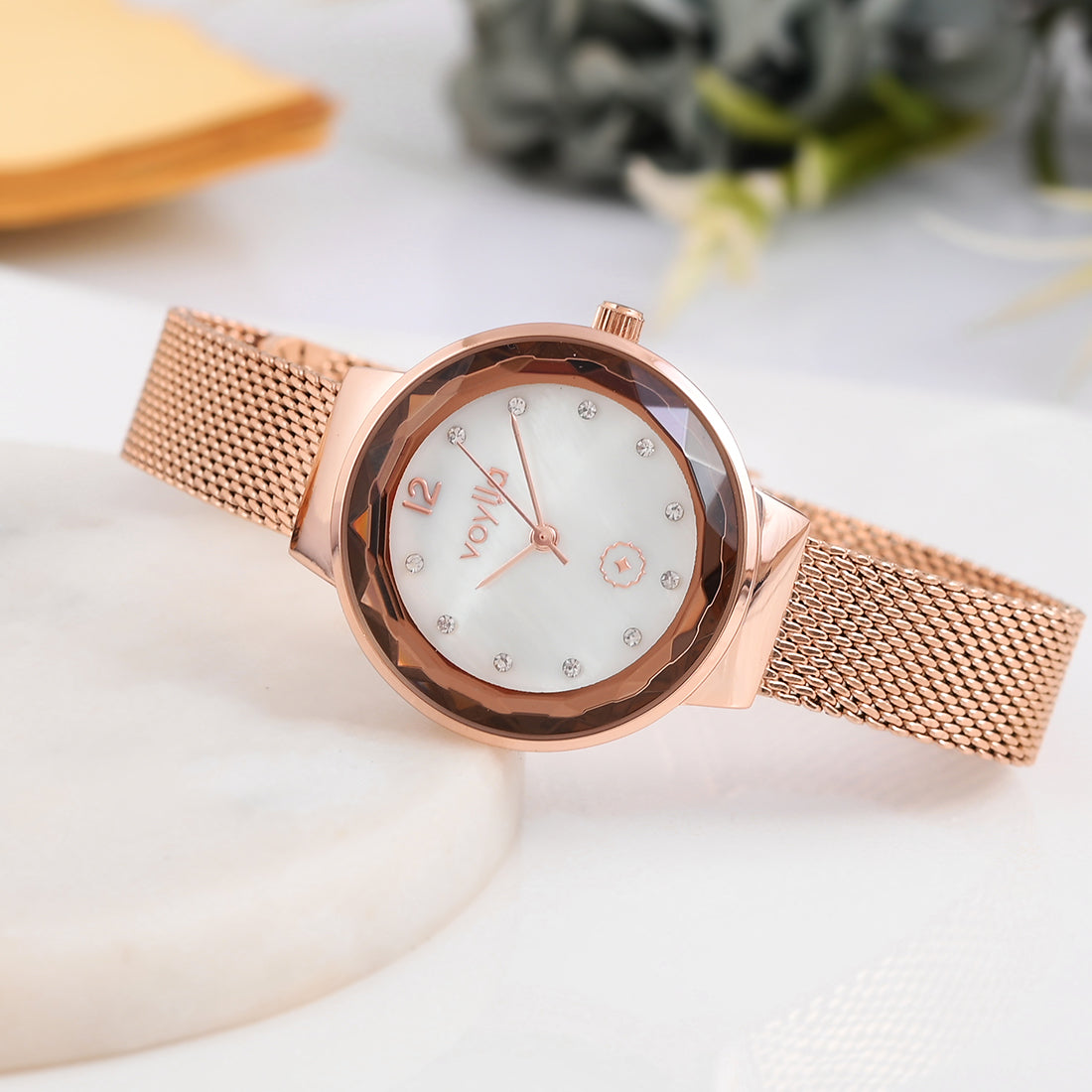 Classic round dial analog watch with rose gold plating. Made from stainless steel and a versatile piece to add to your collection. It will compliment all your looks and outfits.Caring for your fashion jewelry: We, at Voylla, take care of...