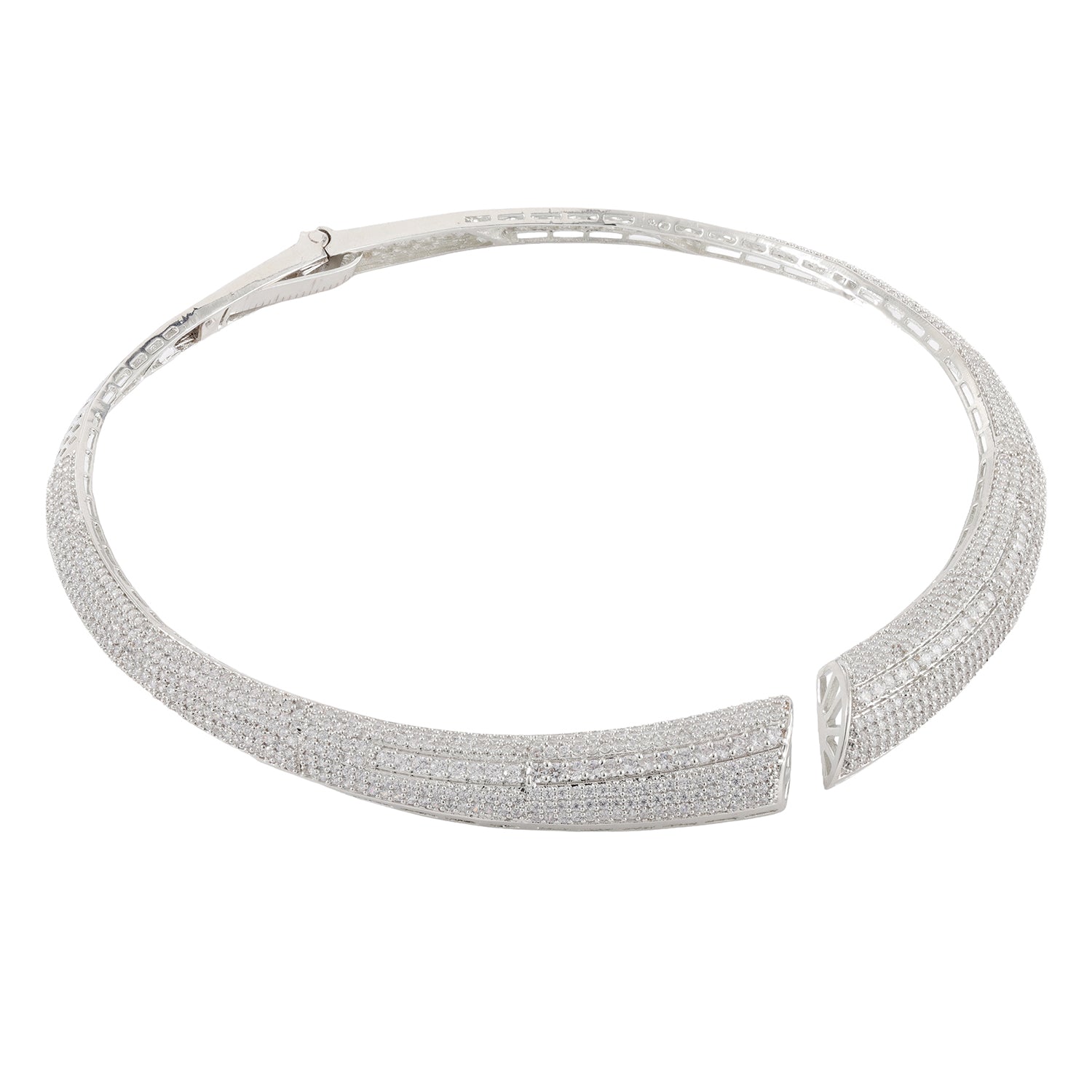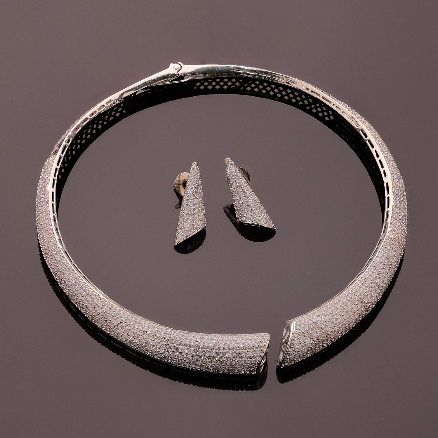 The Sparkling Elegance Lamhe Diamond Hasli Necklace Set captures the timeless, poetic beauty of the most unforgettable Bollywood moments. Crafted from premium brass and plated with luxurious white rhodium, this designer-inspired women necklace set features a bold sculpted hasli silhouette paved with dazzling micro-crystal stones that shine like diamonds under the lights. The matching geometric earrings enhance the modern, cinematic aura of the set, making it a perfect choice for cocktail parties, festive evenings, receptions, sangeet functions, ramp walks, or Bollywood-themed celebrations. A stunning blend of western sophistication and filmy glamour, this hasli necklace is designed to transform any outfit into a red-carpet look. Elegant, trendy, and unforgettable, an ideal gift for women, whether for your lover, wife, sister, or best friend.