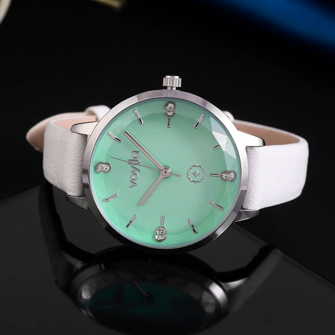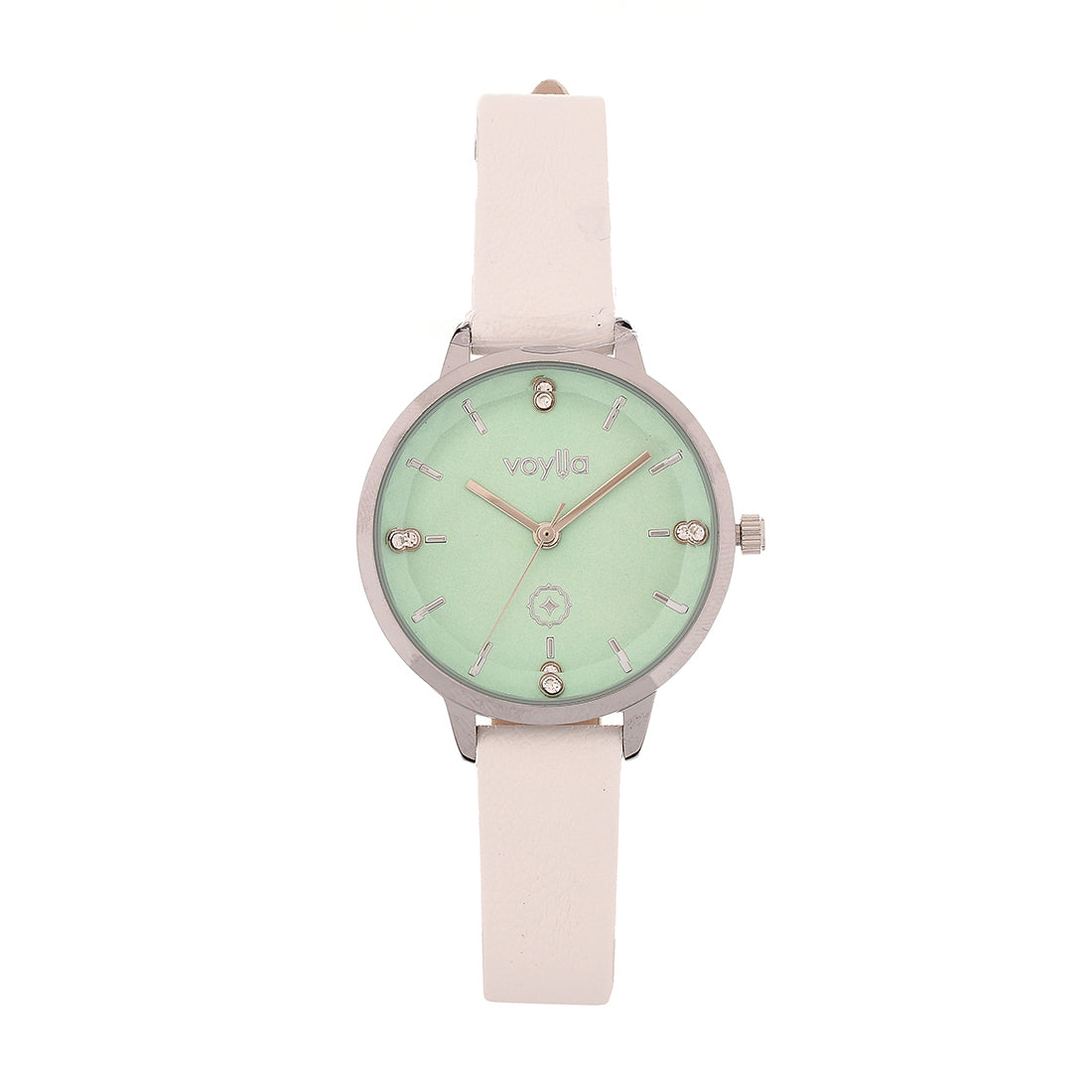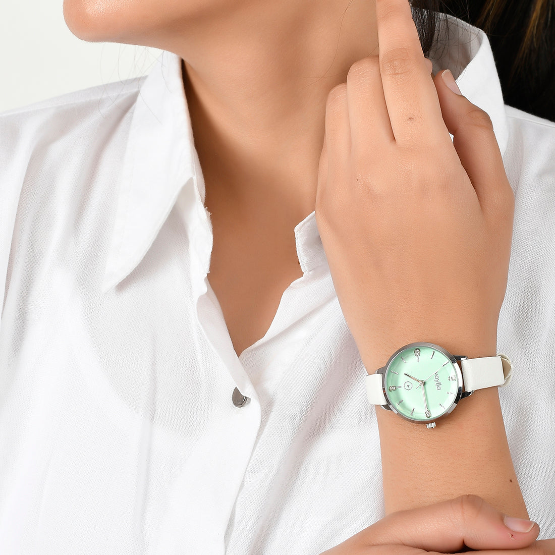 Stylish and fashionable analog watch for women with a beautiful sea green dial. The white rhodium plated watch has been crafted from stainless steel and promises to be a comfortable wear at all times.
