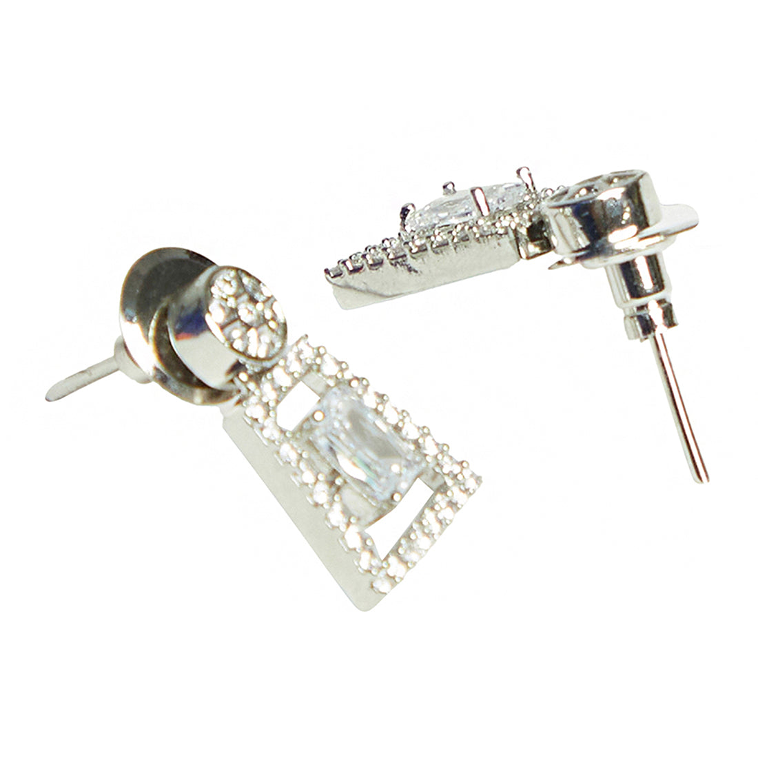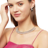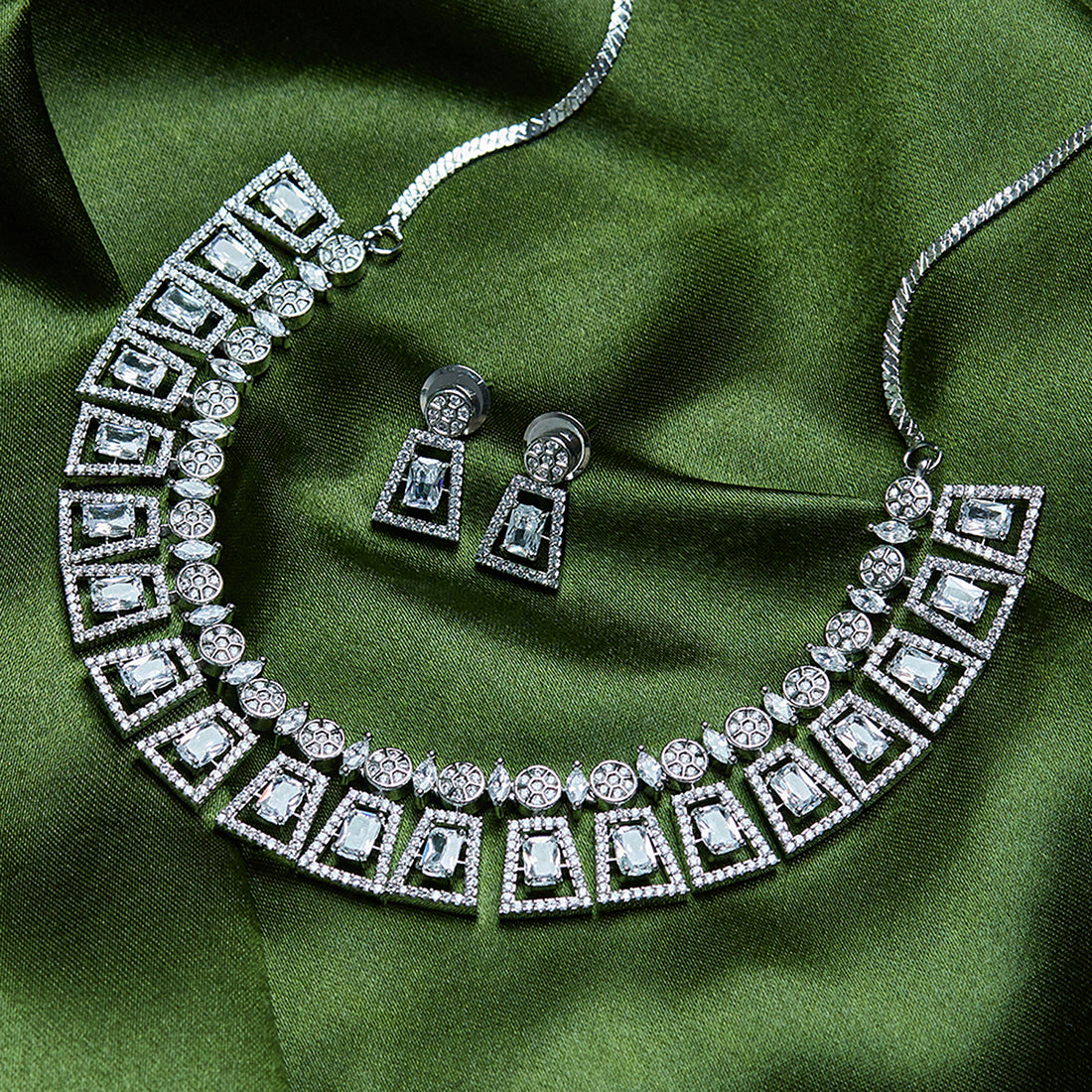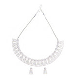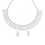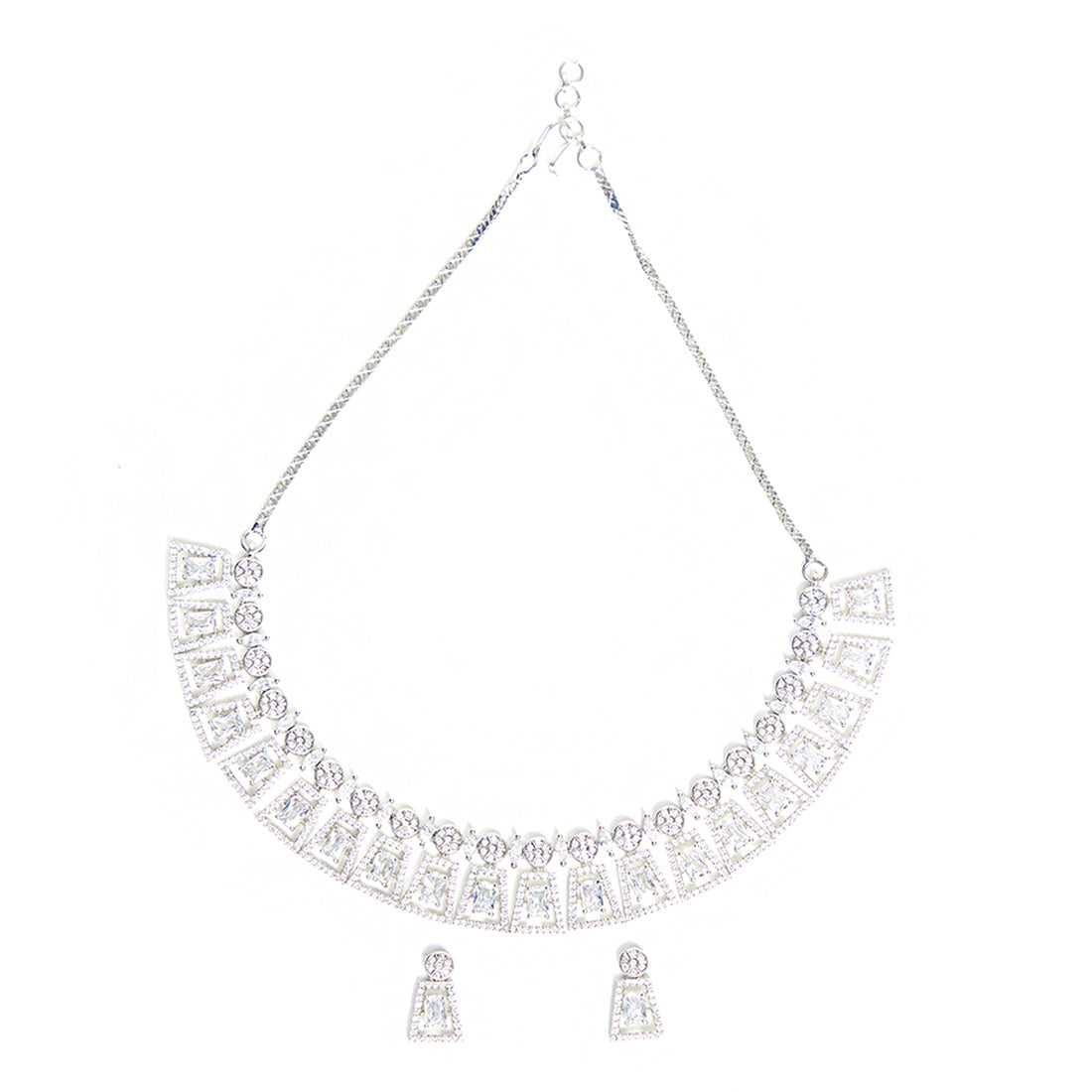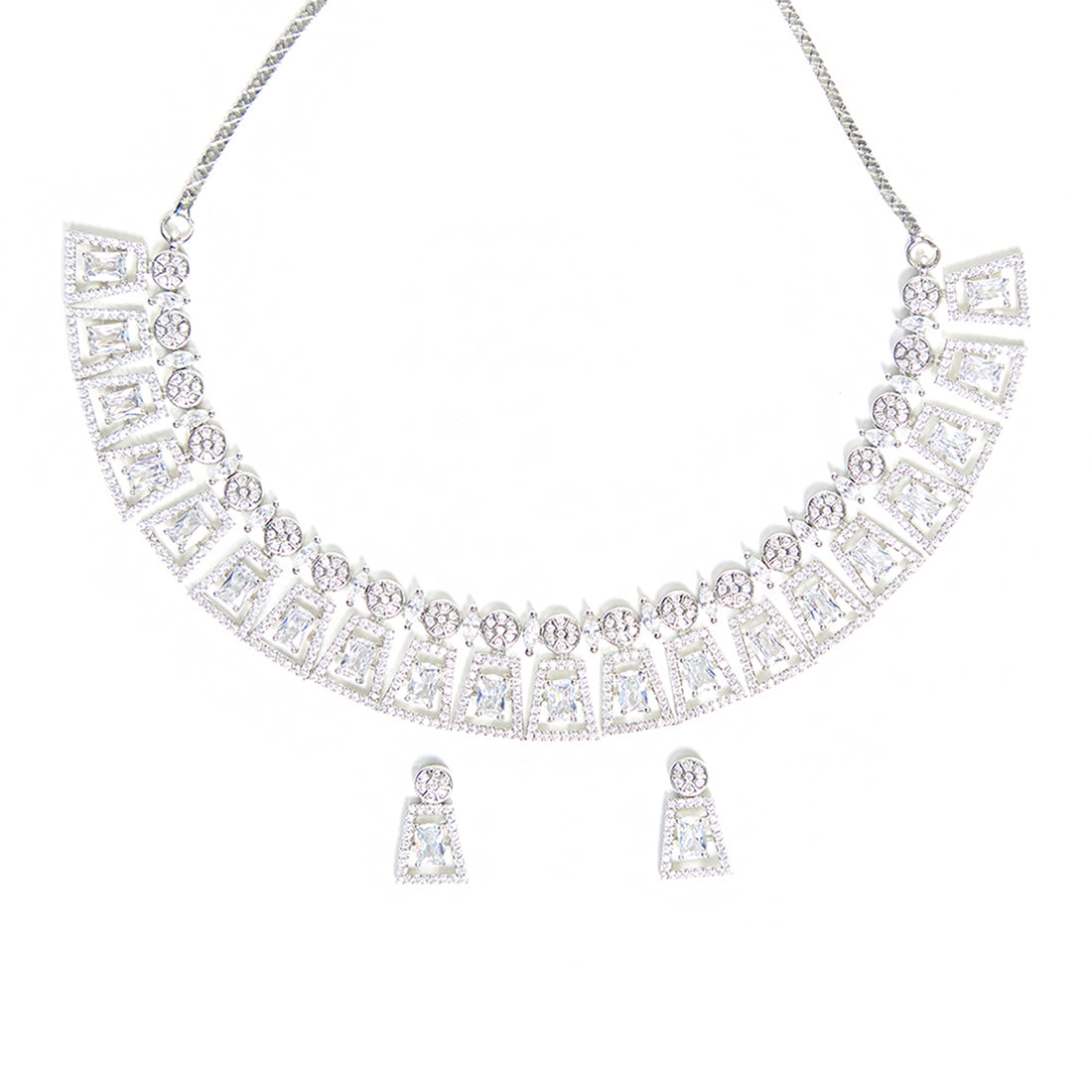 Victorian Era jewelry has inspired this brass necklace set, which has been given a silver plating. Embellished with CZ gems. Pair with a formal gown.